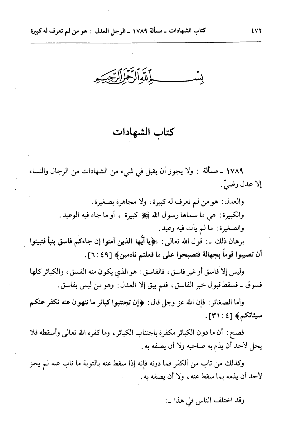 بِسْمِ اللَّهِ الرَّحْمَنِ الرَّحِيمِ كِتَابُ الشَّهَادَاتِ 1789 - مَسْأَلَةٌ: وَلَا يَجُوزُ أَنْ يُقْبَلَ فِي شَيْءٍ مِنْ الشَّهَادَاتِ مِنْ الرِّجَالِ وَالنِّسَاءِ إلَّا عَدْلٌ رَضِيٌّ.