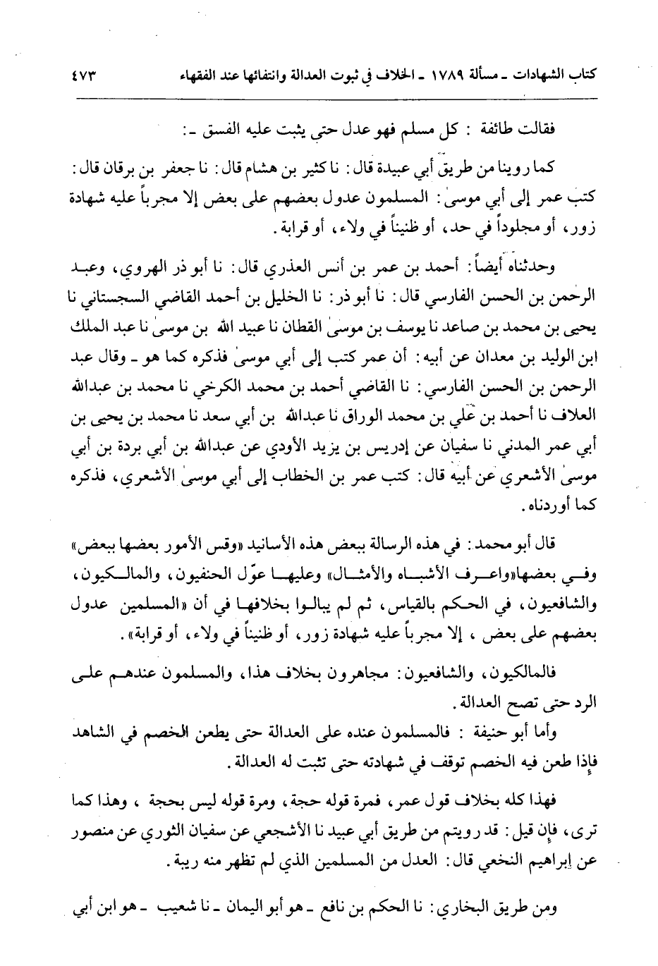 فَقَالَتْ طَائِفَةٌ: كُلُّ مُسْلِمٍ فَهُوَ عَدْلٌ حَتَّى يَثْبُتَ عَلَيْهِ الْفِسْقُ -: كَمَا رُوِّينَا مِنْ طَرِيقِ أَبِي عُبَيْدَةَ قَالَ: نا كَثِيرُ بْنُ هِشَامٍ قَالَ: نا جَعْفَرُ بْنُ بُرْقَانَ قَالَ: كَتَبَ عُمَرُ إلَى أَبِي مُوسَى: الْمُسْلِمُونَ عُدُولٌ بَعْضُهُمْ عَلَى بَعْضٍ إلَّا مُجَرَّبًا عَلَيْهِ شَهَادَةُ زُورٍ، أَوْ مَجْلُودًا فِي حَدٍّ، أَوْ ظَنِينًا فِي وَلَاءٍ، أَوْ قَرَابَةٍ.