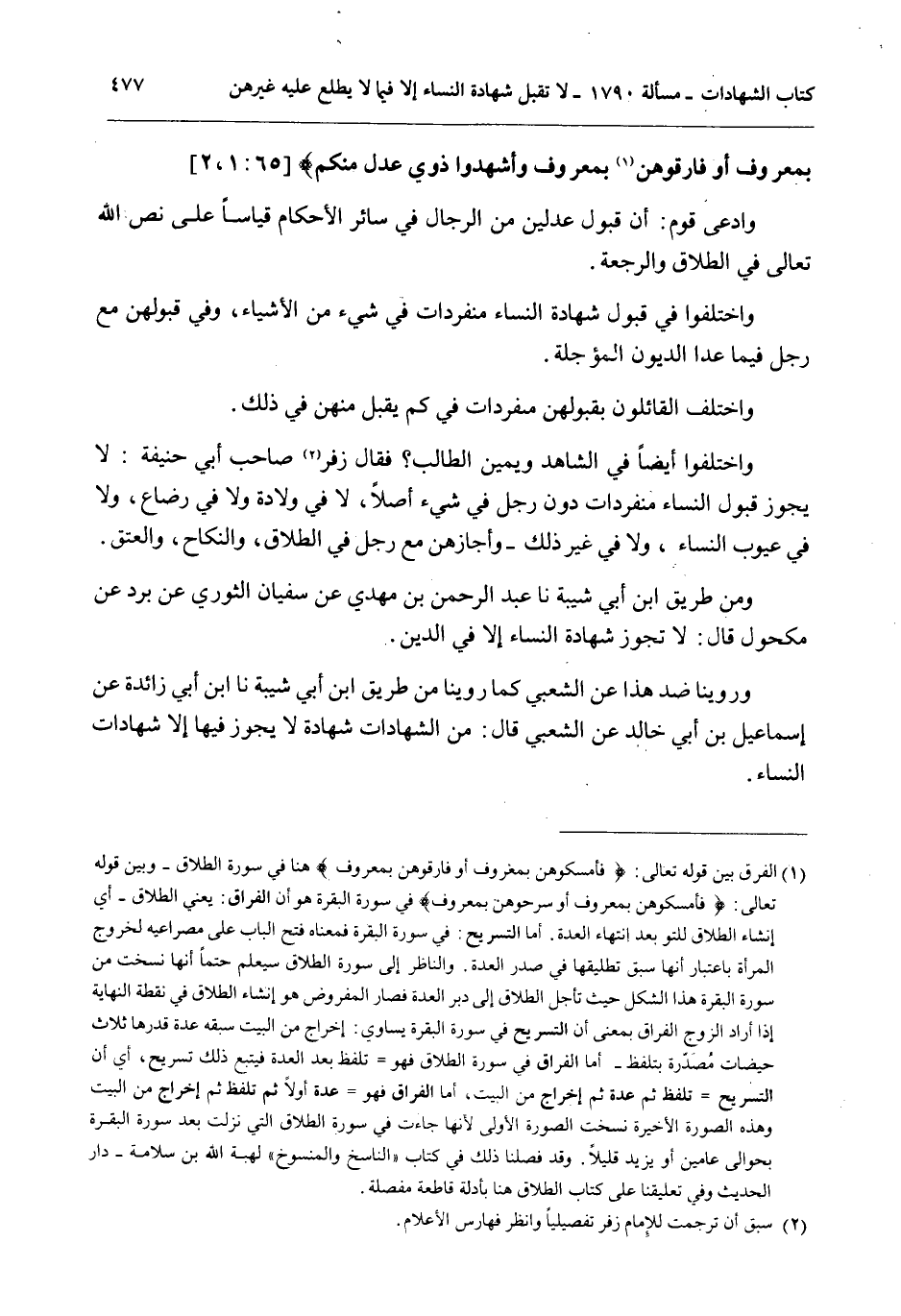 وَادَّعَى قَوْمٌ: أَنَّ قَبُولَ عَدْلَيْنِ مِنْ الرِّجَالِ فِي سَائِرِ الْأَحْكَامِ قِيَاسًا عَلَى نَصِّ اللَّهِ تَعَالَى فِي الطَّلَاقِ وَالرَّجْعَةِ.