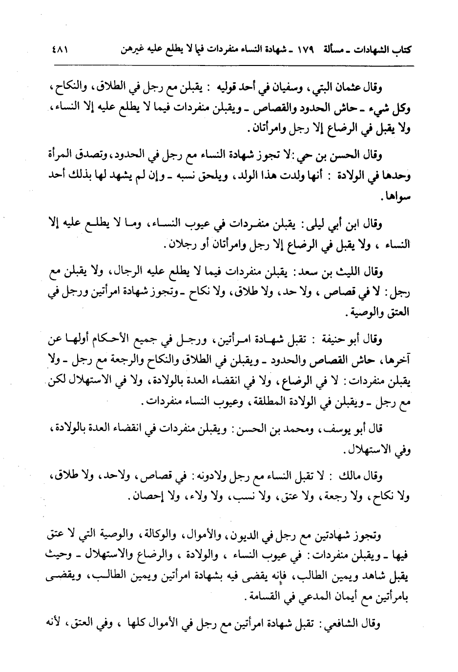 وَقَالَ أَبُو حَنِيفَةَ: تُقْبَلُ شَهَادَةُ امْرَأَتَيْنِ، وَرَجُلٍ فِي جَمِيعِ الْأَحْكَامِ أَوَّلِهَا عَنْ آخِرِهَا، حَاشَ الْقِصَاصَ وَالْحُدُودَ - وَيُقْبَلْنَ فِي الطَّلَاقِ وَالنِّكَاحِ وَالرَّجْعَةِ مَعَ رَجُلٍ - وَلَا يُقْبَلْنَ مُنْفَرِدَاتٍ: لَا فِي الرَّضَاعِ، وَلَا فِي انْقِضَاءِ الْعِدَّةِ بِالْوِلَادَةِ، وَلَا فِي الِاسْتِهْلَالِ لَكِنْ مَعَ رَجُلٍ - وَيُقْبَلْنَ فِي الْوِلَادَةِ الْمُطْلَقَةِ، وَعُيُوبِ النِّسَاءِ مُنْفَرِدَاتٍ.