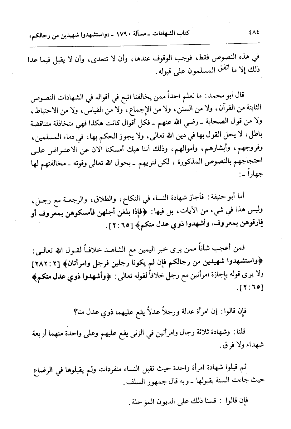 قَالَ أَبُو مُحَمَّدٍ: مَا نَعْلَمُ أَحَدًا مِمَّنْ يُخَالِفُنَا اتَّبَعَ فِي أَقْوَالِهِ فِي الشَّهَادَاتِ النُّصُوصَ الثَّابِتَةَ مِنْ الْقُرْآنِ، وَلَا مِنْ السُّنَنِ، وَلَا مِنْ الْإِجْمَاعِ، وَلَا مِنْ الْقِيَاسِ، وَلَا مِنْ الِاحْتِيَاطِ، وَلَا مِنْ قَوْلِ الصَّحَابَةِ - رَضِيَ اللَّهُ عَنْهُمْ - فَكُلُّ أَقْوَالٍ كَانَتْ هَكَذَا فَهِيَ مُتَخَاذِلَةٌ مُتَنَاقِضَةٌ بَاطِلٌ، لَا يَحِلُّ الْقَوْلُ بِهَا فِي دِينِ اللَّهِ تَعَالَى، وَلَا يَجُوزُ الْحُكْمُ بِهَا، فِي دِمَاءِ الْمُسْلِمِينَ، وَفُرُوجِهِمْ، وَأَبْشَارِهِمْ، وَأَمْوَالِهِمْ، وَذَلِكَ أَنَّنَا هَبْكَ أَمْسَكْنَا الْآنَ عَنْ الِاعْتِرَاضِ عَلَى احْتِجَاجِهِمْ بِالنُّصُوصِ الْمَذْكُورَةِ، لَكِنْ لِنُرِيَهُمْ - بِحَوْلِ اللَّهِ تَعَالَى وَقُوَّتِهِ - مُخَالَفَتَهُمْ لَهَا جِهَارًا -: أَمَّا أَبُو حَنِيفَةَ: فَأَجَازَ شَهَادَةَ النِّسَاءِ فِي النِّكَاحِ، وَالطَّلَاقِ، وَالرَّجْعَةِ مَعَ رَجُلٍ، وَلَيْسَ هَذَا فِي شَيْءٍ مِنْ الْآيَاتِ، بَلْ فِيهَا: {فَإِذَا بَلَغْنَ أَجَلَهُنَّ فَأَمْسِكُوهُنَّ بِمَعْرُوفٍ أَوْ فَارِقُوهُنَّ بِمَعْرُوفٍ وَأَشْهِدُوا ذَوَيْ عَدْلٍ مِنْكُمْ} [الطلاق: 2] .
