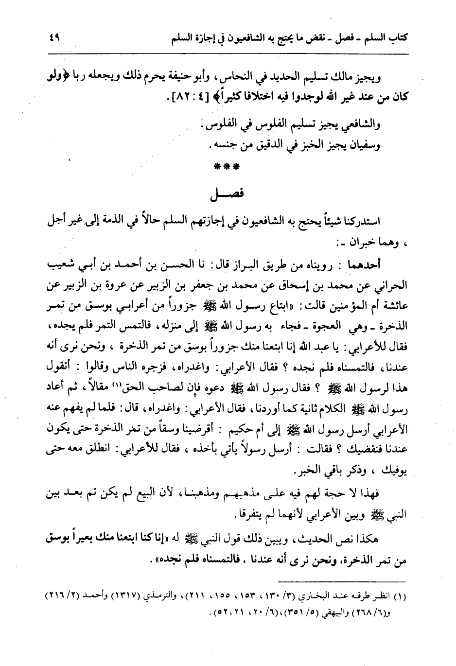 فَصْلٌ اسْتَدْرَكْنَا شَيْئًا يَحْتَجُّ بِهِ الشَّافِعِيُّونَ فِي إجَازَتِهِمْ السَّلَمَ حَالًّا فِي الذِّمَّةِ إلَى غَيْرِ أَجَلٍ، وَهُمَا خَبَرَانِ: أَحَدُهُمَا: رُوِّينَاهُ مِنْ طَرِيقِ الْبَزَّارِ قَالَ: نا الْحَسَنُ بْنُ أَحْمَدَ بْنِ أَبِي شُعَيْبٍ الْحَرَّانِيُّ عَنْ مُحَمَّدِ بْنِ إِسْحَاقَ عَنْ مُحَمَّدِ بْنِ جَعْفَرِ بْنِ الزُّبَيْرِ عَنْ عُرْوَةَ بْنِ الزُّبَيْرِ عَنْ عَائِشَةَ أُمِّ الْمُؤْمِنِينَ قَالَتْ: «ابْتَاعَ رَسُولُ اللَّهِ - صَلَّى اللَّهُ عَلَيْهِ وَسَلَّمَ - جَزُورًا مِنْ أَعْرَابِيٍّ بِوَسْقٍ مِنْ تَمْرِ الذَّخِيرَةِ وَهِيَ الْعَجْوَةُ فَجَاءَ بِهِ رَسُولُ اللَّهِ - صَلَّى اللَّهُ عَلَيْهِ وَسَلَّمَ - إلَى مَنْزِلِهِ، فَالْتَمَسَ التَّمْرَ فَلَمْ يَجِدْهُ، فَقَالَ لِلْأَعْرَابِيِّ: يَا عَبْدَ اللَّهِ إنَّا ابْتَعْنَا مِنْكَ جَزُورًا بِوَسْقٍ مِنْ تَمْرِ الذَّخِيرَةِ، وَنَحْنُ نَرَى أَنَّهُ عِنْدَنَا، فَالْتَمَسْنَاهُ فَلَمْ نَجِدْهُ؟ فَقَالَ الْأَعْرَابِيُّ: وَاغَدْرَاهُ، فَزَجَرَهُ النَّاسُ وَقَالُوا: أَتَقُولُ هَذَا لِرَسُولِ اللَّهِ - صَلَّى اللَّهُ عَلَيْهِ وَسَلَّمَ -؟ فَقَالَ رَسُولُ اللَّهِ - صَلَّى اللَّهُ عَلَيْهِ وَسَلَّمَ - دَعُوهُ فَإِنَّ لِصَاحِبِ الْحَقِّ مَقَالًا، ثُمَّ أَعَادَ رَسُولُ اللَّهِ - صَلَّى اللَّهُ عَلَيْهِ وَسَلَّمَ - الْكَلَامَ ثَانِيَةً كَمَا أَوْرَدْنَا، فَقَالَ الْأَعْرَابِيُّ: وَاغَدْرَاهُ، قَالَ: فَلَمَّا لَمْ يَفْهَمْ عَنْهُ الْأَعْرَابِيُّ أَرْسَلَ رَسُولُ اللَّهِ - صَلَّى اللَّهُ عَلَيْهِ وَسَلَّمَ - إلَى أُمِّ حَكِيمٍ: أَقْرِضِينَا وَسْقًا مِنْ تَمْرِ الذَّخِيرَةِ حَتَّى يَكُونَ عِنْدَنَا فَنَقْضِيَكَ؟ فَقَالَتْ: أَرْسِلْ رَسُولًا يَأْتِي يَأْخُذُهُ، فَقَالَ لِلْأَعْرَابِيِّ: انْطَلِقْ مَعَهُ حَتَّى يُوفِيَكَ» وَذُكِرَ بَاقِي الْخَبَرِ.
