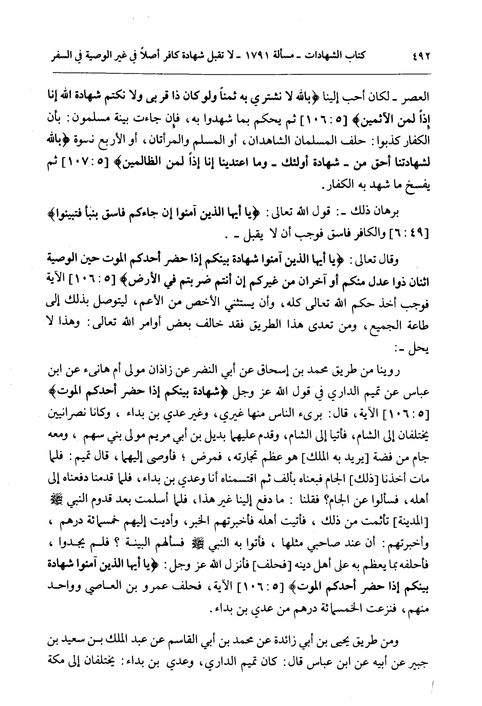وَقَالَ تَعَالَى: {يَا أَيُّهَا الَّذِينَ آمَنُوا شَهَادَةُ بَيْنِكُمْ إِذَا حَضَرَ أَحَدَكُمُ الْمَوْتُ حِينَ الْوَصِيَّةِ اثْنَانِ ذَوَا عَدْلٍ مِنْكُمْ أَوْ آخَرَانِ مِنْ غَيْرِكُمْ إِنْ أَنْتُمْ ضَرَبْتُمْ فِي الأَرْضِ} [المائدة: 106] الْآيَةَ فَوَجَبَ أَخْذُ حُكْمِ اللَّهِ تَعَالَى كُلِّهِ، وَأَنْ يَسْتَثْنِيَ الْأَخَصَّ مِنْ الْأَعَمِّ، لِيُتَوَصَّلَ بِذَلِكَ إلَى طَاعَةِ الْجَمِيعِ، وَمَنْ تَعَدَّى هَذَا الطَّرِيقَ فَقَدْ خَالَفَ بَعْضَ أَوَامِرِ اللَّهِ تَعَالَى: وَهَذَا لَا يَحِلُّ -: رُوِّينَا مِنْ طَرِيقِ مُحَمَّدِ بْنِ إِسْحَاقَ عَنْ أَبِي النَّضْرِ عَنْ زَاذَانَ مَوْلَى أُمِّ هَانِئٍ عَنْ ابْنِ عَبَّاسٍ «عَنْ تَمِيمٍ الدَّارِيِّ فِي قَوْلِ اللَّهِ عَزَّ وَجَلَّ {شَهَادَةُ بَيْنِكُمْ إِذَا حَضَرَ أَحَدَكُمُ الْمَوْتُ} [المائدة: 106] الْآيَةَ، قَالَ: بَرِئَ النَّاسُ مِنْهَا غَيْرِي، وَغَيْرَ عَدِيِّ بْنِ بُدَاءٍ، وَكَانَا نَصْرَانِيَّيْنِ يَخْتَلِفَانِ إلَى الشَّامِ، فَأَتَيَا إلَى الشَّامِ، وَقَدِمَ عَلَيْهِمَا بُدَيْلُ بْنُ أَبِي مَرْيَمَ مَوْلَى بَنِي سَهْمٍ، وَمَعَهُ جَامٌ مِنْ فِضَّةٍ يُرِيدُ بِهِ الْمَلِكَ هُوَ عُظْمُ تِجَارَتِهِ، فَمَرِضَ؛ فَأَوْصَى إلَيْهَا، قَالَ تَمِيمٌ: فَلَمَّا مَاتَ أَخَذْنَا ذَلِكَ الْجَامَ فَبِعْنَاهُ بِأَلْفٍ ثُمَّ اقْتَسَمْنَاهُ أَنَا وَعَدِيُّ بْنُ بُدَاءٍ، فَلَمَّا قَدِمْنَا دَفَعْنَاهُ إلَى أَهْلِهِ، فَسَأَلُوا عَنْ الْجَامِ؟ فَقُلْنَا: مَا دَفَعَ إلَيْنَا غَيْرَ هَذَا، فَلَمَّا أَسْلَمْتُ بَعْدَ قُدُومِ النَّبِيِّ - صَلَّى اللَّهُ عَلَيْهِ وَسَلَّمَ - الْمَدِينَةَ تَأَثَّمْتُ مِنْ ذَلِكَ، فَأَتَيْتُ أَهْلَهُ فَأَخْبَرْتهمْ الْخَبَرَ، وَأَدَّيْتُ إلَيْهِمْ خَمْسَمِائَةِ دِرْهَمٍ، وَأَخْبَرْتُهُمْ: أَنَّ عِنْدَ صَاحِبِي مِثْلَهَا، فَأَتَوْا بِهِ النَّبِيَّ - صَلَّى اللَّهُ عَلَيْهِ وَسَلَّمَ - فَسَأَلَهُمْ الْبَيِّنَةَ؟ فَلَمْ يَجِدُوا، فَأَحْلَفَهُ بِمَا يُعْظَمُ بِهِ عَلَى أَهْلِ دِينِهِ فَحَلَفَ فَأَنْزَلَ اللَّهُ عَزَّ وَجَلَّ: {يَا أَيُّهَا الَّذِينَ آمَنُوا شَهَادَةُ بَيْنِكُمْ إِذَا حَضَرَ أَحَدَكُمُ الْمَوْتُ} [المائدة: 106] الْآيَةَ، فَحَلَفَ عَمْرُو بْنُ الْعَاصِ وَوَاحِدٌ مِنْهُمْ، فَنُزِعَتْ الْخَمْسُمِائَةِ دِرْهَمٍ مِنْ عَدِيِّ بْنِ بُدَاءٍ» .