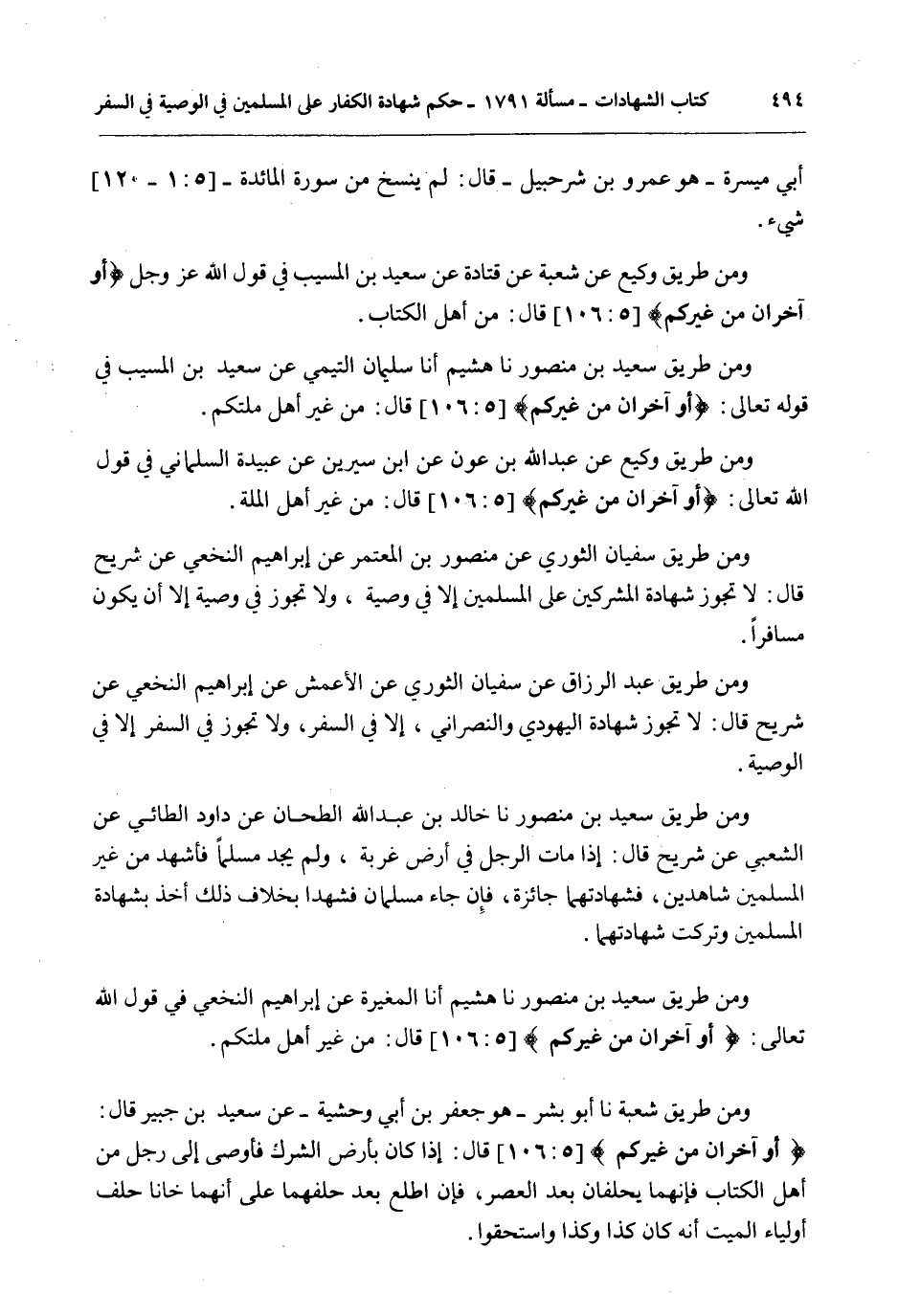 وَمِنْ طَرِيقِ سُفْيَانَ الثَّوْرِيِّ عَنْ مَنْصُورِ بْنِ الْمُعْتَمِرِ عَنْ إبْرَاهِيمَ النَّخَعِيِّ عَنْ شُرَيْحٍ قَالَ: لَا تَجُوزُ شَهَادَةُ الْمُشْرِكِينَ عَلَى الْمُسْلِمِينَ إلَّا فِي وَصِيَّةٍ، وَلَا تَجُوزُ فِي وَصِيَّةٍ إلَّا أَنْ يَكُونَ مُسَافِرًا.