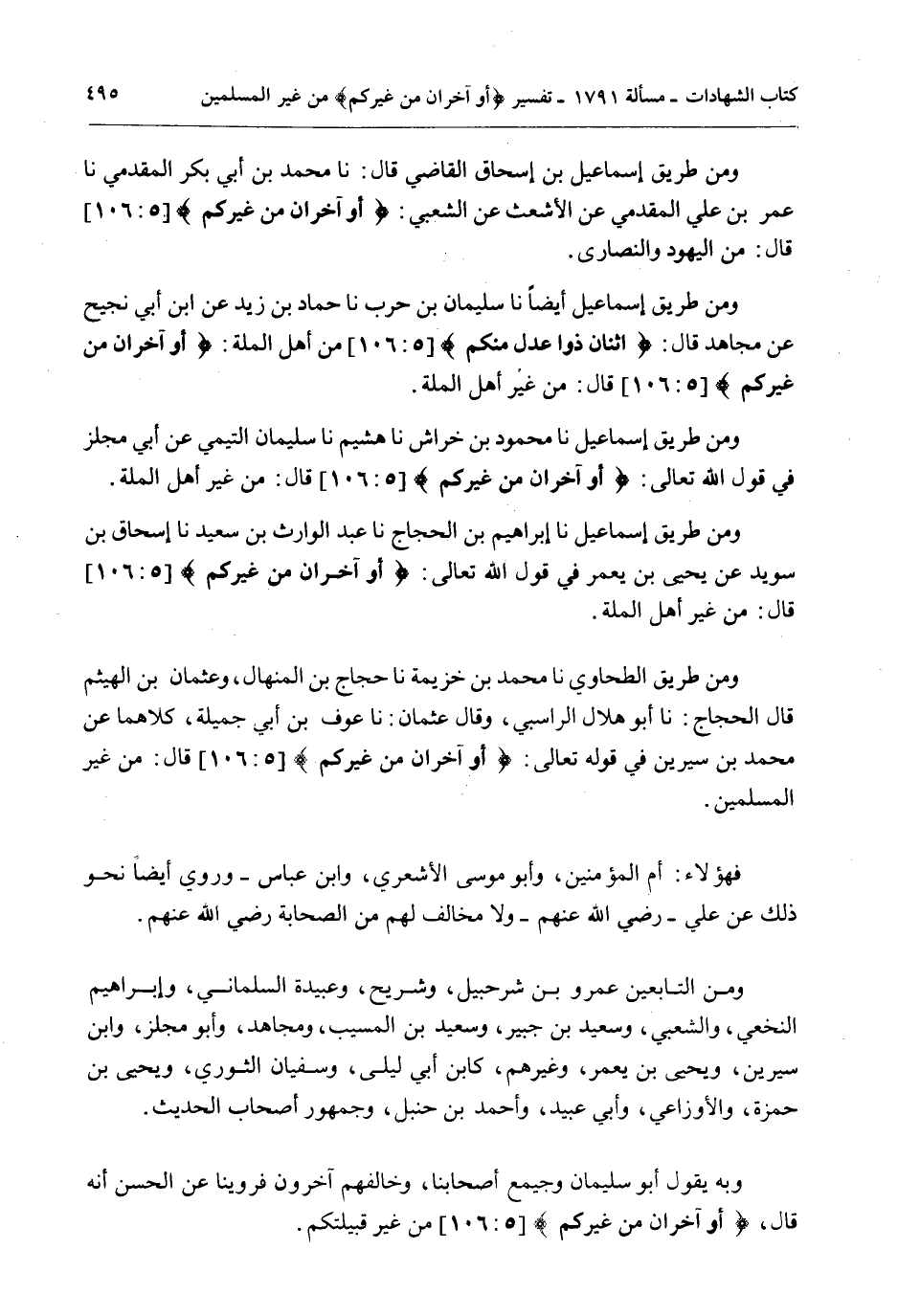 وَمِنْ طَرِيقِ إسْمَاعِيلَ بْنِ إِسْحَاقَ الْقَاضِي قَالَ: نا مُحَمَّدُ بْنُ أَبِي بَكْرٍ الْمُقَدَّمِيُّ نا عُمَرُ بْنُ عَلِيٍّ الْمُقَدَّمِيُّ عَنْ الْأَشْعَثِ عَنْ الشَّعْبِيِّ: {أَوْ آخَرَانِ مِنْ غَيْرِكُمْ} [المائدة: 106] قَالَ: مِنْ الْيَهُودِ وَالنَّصَارَى.