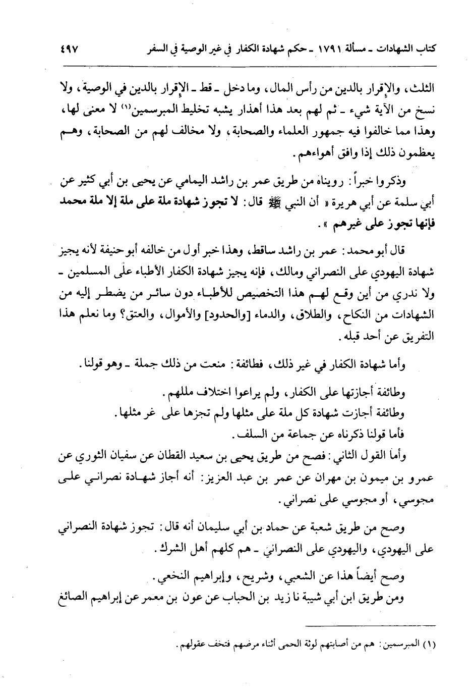 الثُّلُثِ، وَالْإِقْرَارَ بِالدَّيْنِ مِنْ رَأْسِ الْمَالِ، وَمَا دَخَلَ - قَطُّ - الْإِقْرَارُ بِالدَّيْنِ فِي الْوَصِيَّةِ، وَلَا نُسِخَ مِنْ الْآيَةِ شَيْءٌ - ثُمَّ لَهُمْ بَعْدَ هَذَا أَهْذَارٌ يُشْبِهُ تَخْلِيطَ الْمُبَرْسَمِينَ لَا مَعْنَى لَهَا، وَهَذَا مِمَّا خَالَفُوا فِيهِ جُمْهُورَ الْعُلَمَاءِ وَالصَّحَابَةِ، وَلَا مُخَالِفَ لَهُمْ مِنْ الصَّحَابَةِ، وَهُمْ يُعَظِّمُونَ ذَلِكَ إذَا وَافَقَ أَهْوَاءَهُمْ.