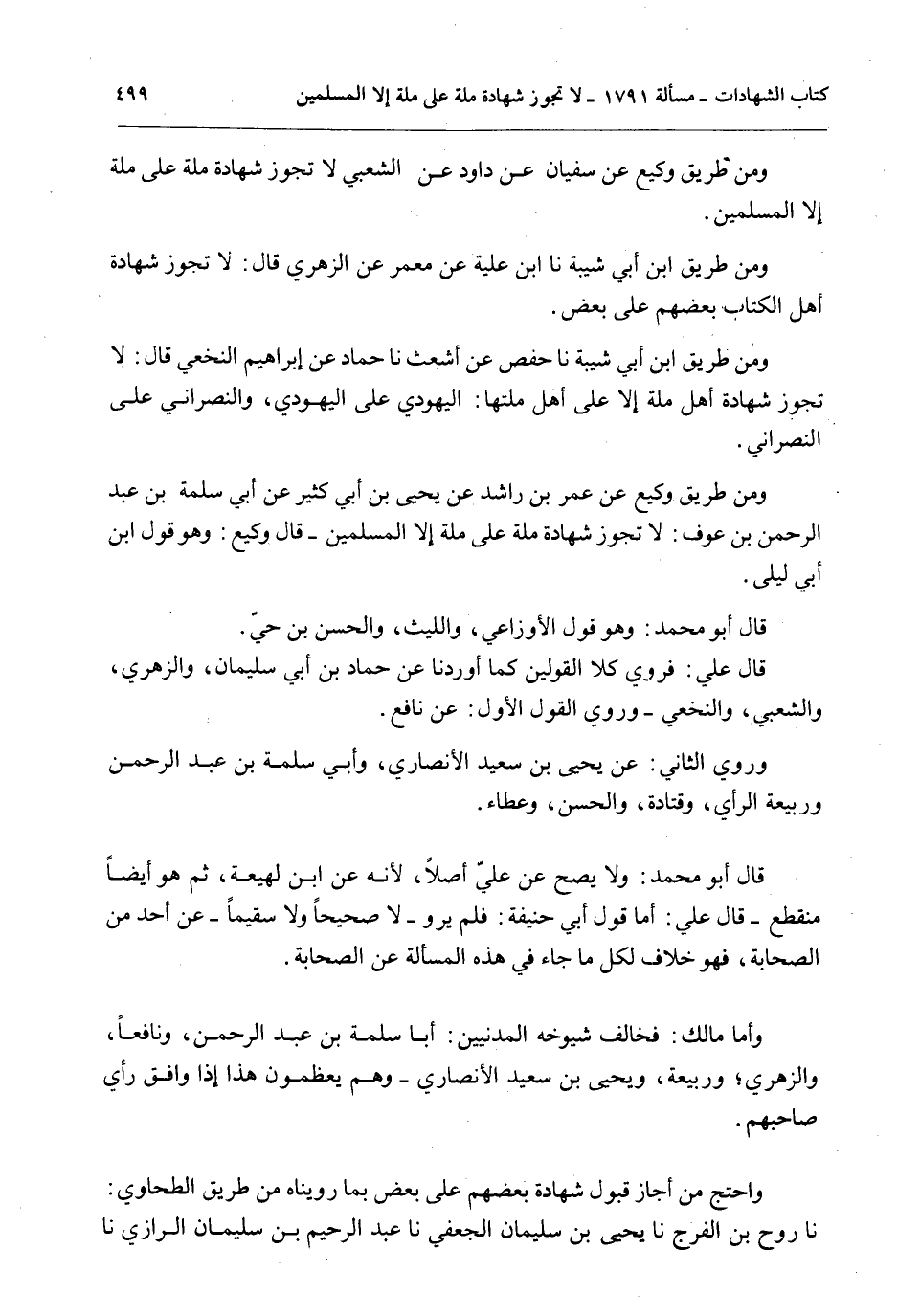 وَمِنْ طَرِيقِ وَكِيعٍ عَنْ عُمَرَ بْنِ رَاشِدٍ عَنْ يَحْيَى بْنِ أَبِي كَثِيرٍ عَنْ أَبِي سَلَمَةَ بْنِ عَبْدِ الرَّحْمَنِ بْنِ عَوْفٍ: لَا تَجُوزُ شَهَادَةُ مِلَّةٍ عَلَى مِلَّةٍ إلَّا الْمُسْلِمِينَ - قَالَ وَكِيعٌ: وَهُوَ قَوْلُ ابْنِ أَبِي لَيْلَى.
