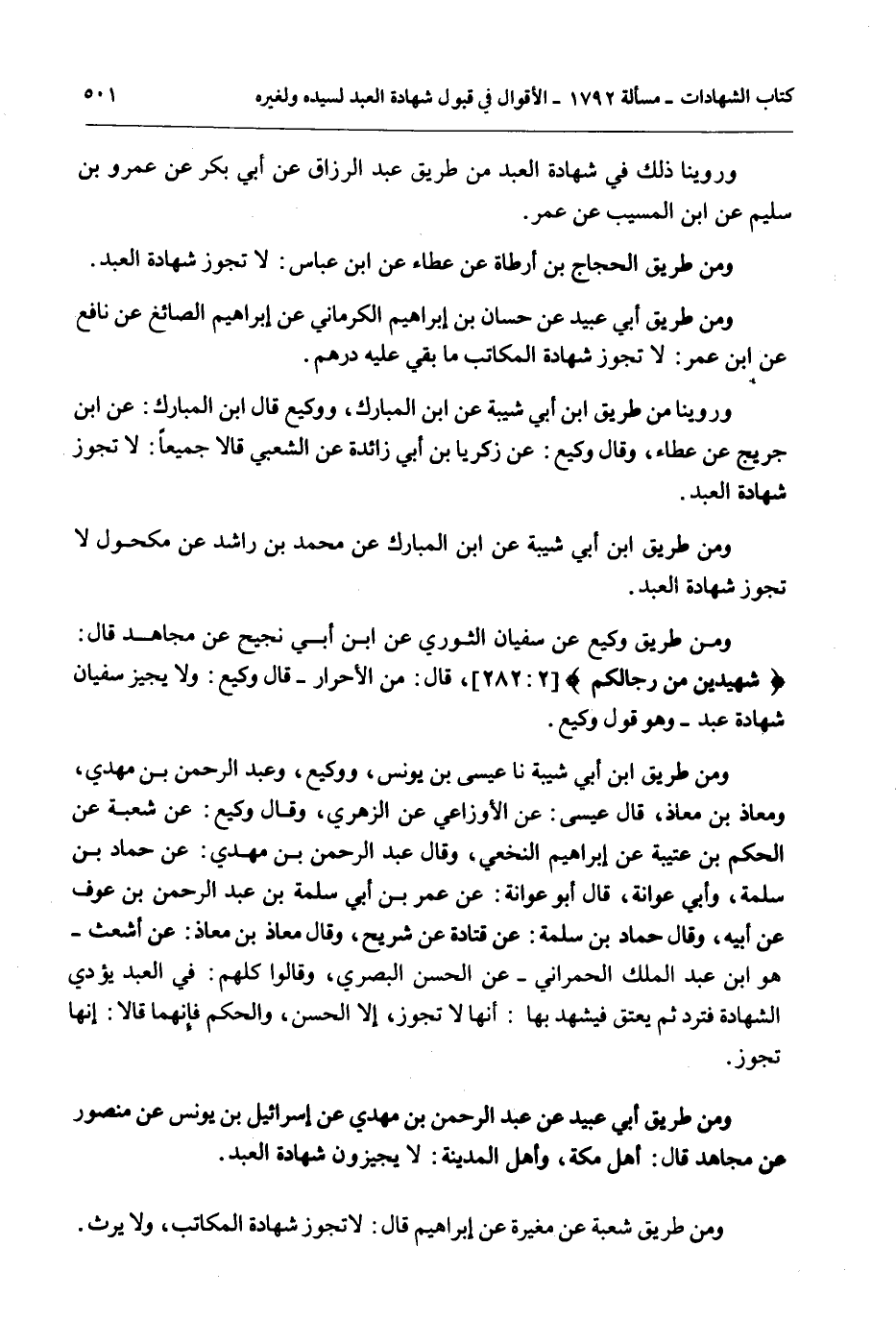 وَمِنْ طَرِيقِ ابْنِ أَبِي شَيْبَةَ نا عِيسَى بْنُ يُونُسَ، وَوَكِيعٌ، وَعَبْدُ الرَّحْمَنِ بْنُ مَهْدِيٍّ، وَمُعَاذُ بْنُ مُعَاذٍ، قَالَ عِيسَى: عَنْ الْأَوْزَاعِيِّ عَنْ الزُّهْرِيِّ، وَقَالَ وَكِيعٌ: عَنْ شُعْبَةَ عَنْ الْحَكَمِ بْنِ عُتَيْبَةَ عَنْ إبْرَاهِيمَ النَّخَعِيِّ، وَقَالَ عَبْدُ الرَّحْمَنِ بْنُ مَهْدِيٍّ: عَنْ حَمَّادِ بْنِ سَلَمَةَ، وَأَبِي عَوَانَةَ، قَالَ أَبُو عَوَانَةَ: عَنْ عُمَرَ بْنِ أَبِي سَلَمَةَ بْنِ عَبْدِ الرَّحْمَنِ بْنِ عَوْفٍ عَنْ أَبِيهِ، وَقَالَ حَمَّادُ بْنُ سَلَمَةَ: عَنْ قَتَادَةَ عَنْ شُرَيْحٍ، وَقَالَ مُعَاذُ بْنُ مُعَاذٍ: عَنْ أَشْعَثَ هُوَ ابْنُ عَبْدِ الْمَلِكِ الْحُمْرَانِيِّ - عَنْ الْحَسَنِ الْبَصْرِيِّ، وَقَالُوا كُلُّهُمْ: فِي الْعَبْدِ يُؤَدِّي الشَّهَادَةَ فَتُرَدُّ ثُمَّ يُعْتَقُ فَيَشْهَدُ بِهَا: أَنَّهَا لَا تَجُوزُ، إلَّا الْحَسَنُ، وَالْحَكَمُ فَإِنَّهُمَا قَالَا: إنَّهَا تَجُوزُ.