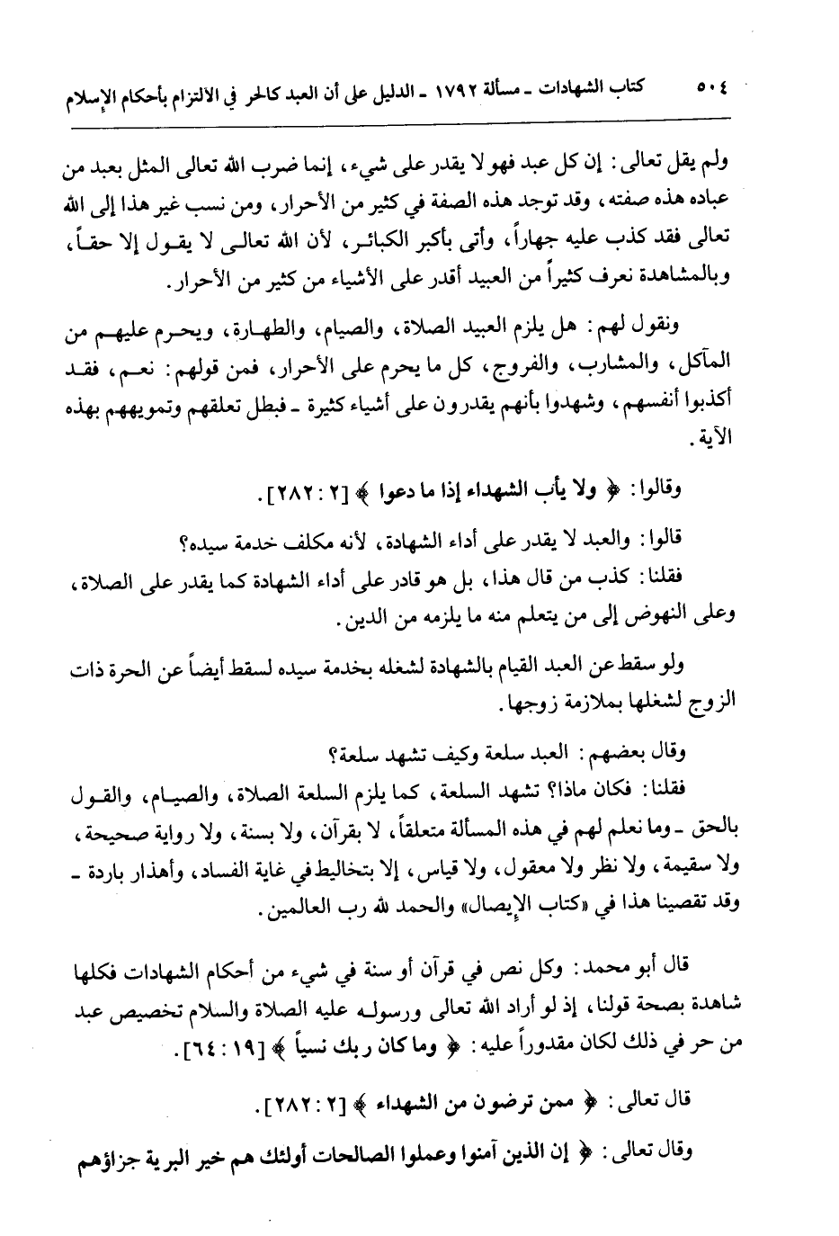 قَالَ أَبُو مُحَمَّدٍ: وَكُلُّ نَصٍّ فِي قُرْآنٍ أَوْ سُنَّةٍ فِي شَيْءٍ مِنْ أَحْكَامِ الشَّهَادَاتِ فَكُلُّهَا شَاهِدَةٌ بِصِحَّةِ قَوْلِنَا، إذْ لَوْ أَرَادَ اللَّهُ تَعَالَى وَرَسُولُهُ - عَلَيْهِ الصَّلَاةُ وَالسَّلَامُ - تَخْصِيصَ عَبْدٍ مِنْ حُرٍّ فِي ذَلِكَ لَكَانَ مَقْدُورًا عَلَيْهِ: {وَمَا كَانَ رَبُّكَ نَسِيًّا} [مريم: 64]