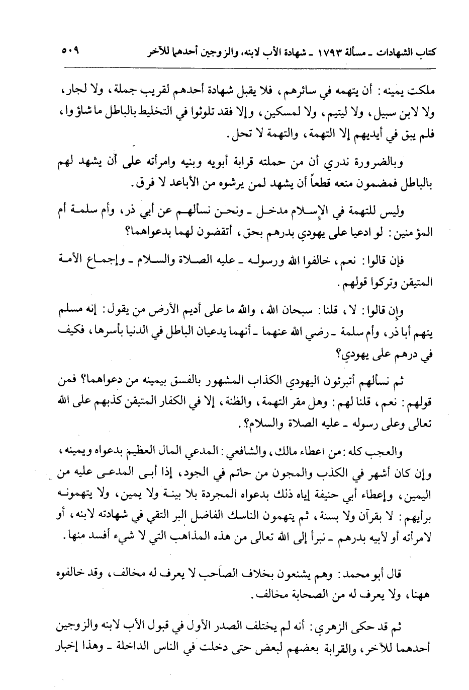 وَلَيْسَ لِلتُّهْمَةِ فِي الْإِسْلَامِ مَدْخَلٌ - وَنَحْنُ نَسْأَلُهُمْ عَنْ أَبِي ذَرٍّ، وَأُمِّ سَلَمَةَ أُمِّ الْمُؤْمِنِينَ: لَوْ ادَّعَيَا عَلَى يَهُودِيٍّ بِدِرْهَمٍ بِحَقٍّ، أَتَقْضُونَ لَهُمَا بِدَعْوَاهُمَا؟ فَإِنْ قَالُوا: نَعَمْ، خَالَفُوا اللَّهَ وَرَسُولَهُ - عَلَيْهِ الصَّلَاةُ وَالسَّلَامُ - وَإِجْمَاعَ الْأُمَّةِ الْمُتَيَقَّنَ وَتَرَكُوا قَوْلَهُمْ.