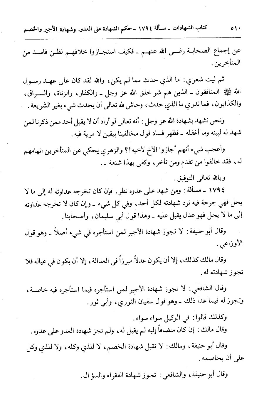 1794 - مَسْأَلَةٌ: وَمَنْ شَهِدَ عَلَى عَدُوِّهِ نُظِرَ، فَإِنْ كَانَ تُخْرِجُهُ عَدَاوَتُهُ لَهُ إلَى مَا لَا يَحِلُّ فَهِيَ جُرْحَةٌ فِيهِ تَرُدُّ شَهَادَتَهُ لِكُلِّ أَحَدٍ، وَفِي كُلِّ شَيْءٍ - وَإِنْ كَانَ لَا تُخْرِجُهُ عَدَاوَتُهُ إلَى مَا لَا يَحِلُّ فَهُوَ عَدْلٌ يُقْبَلُ عَلَيْهِ - وَهَذَا قَوْلُ أَبِي سُلَيْمَانَ، وَأَصْحَابِنَا.