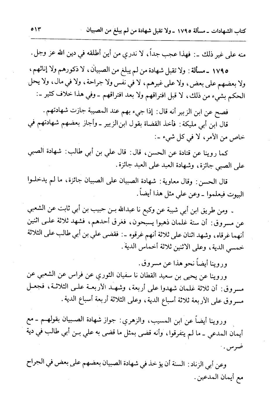1795 - مَسْأَلَةٌ: وَلَا تُقْبَلُ شَهَادَةُ مَنْ لَمْ يَبْلُغْ مِنْ الصِّبْيَانِ، لَا ذُكُورِهِمْ وَلَا إنَاثِهِمْ، وَلَا بَعْضِهِمْ عَلَى بَعْضٍ، وَلَا عَلَى غَيْرِهِمْ، لَا فِي نَفْسٍ وَلَا جِرَاحَةٍ، وَلَا فِي مَالٍ، وَلَا يَحِلُّ الْحُكْمُ بِشَيْءٍ مِنْ ذَلِكَ، لَا قَبْلَ افْتِرَاقِهِمْ وَلَا بَعْدَ افْتِرَاقِهِمْ - وَفِي هَذَا خِلَافٌ كَثِيرٌ -: فَصَحَّ عَنْ ابْنِ الزُّبَيْرِ أَنَّهُ قَالَ: إذَا جِيءَ بِهِمْ عِنْدَ الْمُصِيبَةِ جَازَتْ شَهَادَتُهُمْ.