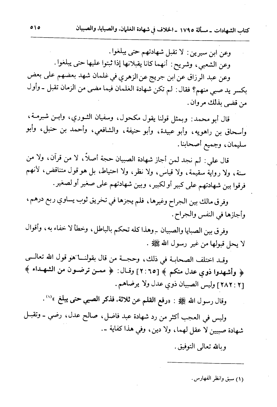 قَالَ عَلِيٌّ: لَمْ نَجِدْ لِمَنْ أَجَازَ شَهَادَةَ الصِّبْيَانِ حُجَّةً أَصْلًا، لَا مِنْ قُرْآنٍ، وَلَا مِنْ سُنَّةٍ، وَلَا رِوَايَةٍ سَقِيمَةٍ، وَلَا قِيَاسٍ، وَلَا نَظَرٍ، وَلَا احْتِيَاطٍ، بَلْ هُوَ قَوْلٌ مُتَنَاقِضٌ، لِأَنَّهُمْ فَرَّقُوا بَيْنَ شَهَادَتِهِمْ عَلَى كَبِيرٍ أَوْ لِكَبِيرٍ، وَبَيْنَ شَهَادَتِهِمْ عَلَى صَغِيرٍ أَوْ لِصَغِيرٍ.