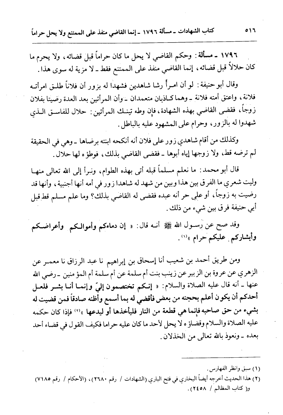 وَمِنْ طَرِيقِ أَحْمَدَ بْنِ شُعَيْبٍ أَنَا إِسْحَاقُ بْنُ إبْرَاهِيمَ نا عَبْدُ الرَّزَّاقِ نا مَعْمَرٌ عَنْ الزُّهْرِيِّ عَنْ عُرْوَةَ بْنِ الزُّبَيْرِ عَنْ زَيْنَبَ بِنْتِ أُمِّ سَلَمَةَ عَنْ أُمِّ سَلَمَةَ أُمِّ الْمُؤْمِنِينَ - رَضِيَ اللَّهُ عَنْهَا - أَنَّهُ قَالَ - عَلَيْهِ الصَّلَاةُ وَالسَّلَامُ -: «إنَّكُمْ تَخْتَصِمُونَ إلَيَّ وَإِنَّمَا أَنَا بَشَرٌ فَلَعَلَّ أَحَدَكُمْ أَنْ يَكُونَ أَعْلَمَ بِحُجَّتِهِ مِنْ بَعْضٍ فَأَقْضِيَ لَهُ بِمَا أَسْمَعُ وَأَظُنُّهُ صَادِقًا فَمَنْ قَضَيْتُ لَهُ بِشَيْءٍ مِنْ حَقِّ صَاحِبِهِ فَإِنَّمَا هِيَ قِطْعَةٌ مِنْ النَّارِ فَلْيَأْخُذْهَا أَوْ لِيَدَعْهَا» فَإِذَا كَانَ حُكْمُهُ - عَلَيْهِ الصَّلَاةُ وَالسَّلَامُ - وَقَضَاؤُهُ لَا يُحِلُّ لِأَحَدٍ مَا كَانَ عَلَيْهِ حَرَامًا فَكَيْفَ الْقَوْلُ فِي قَضَاءِ أَحَدٍ بَعْدَهُ - وَنَعُوذُ بِاَللَّهِ تَعَالَى مِنْ الْخِذْلَانِ.