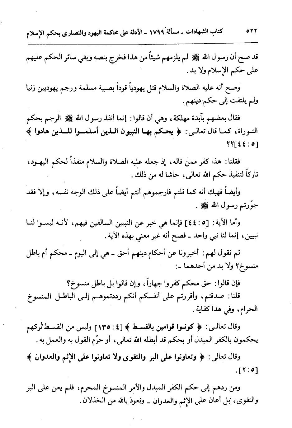 وَقَالَ تَعَالَى: {كُونُوا قَوَّامِينَ بِالْقِسْطِ} [النساء: 135] وَلَيْسَ مِنْ الْقِسْطِ تَرْكُهُمْ يَحْكُمُونَ بِالْكُفْرِ الْمُبَدَّلِ أَوْ بِحُكْمٍ قَدْ أَبْطَلَهُ اللَّهُ تَعَالَى، أَوْ حَرَّمَ الْقَوْلَ بِهِ وَالْعَمَلَ بِهِ.