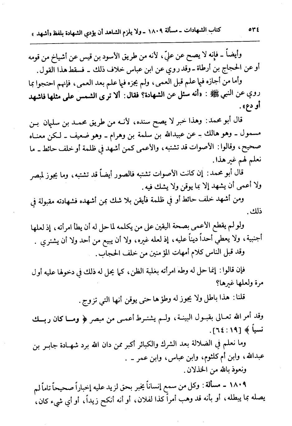 قَالَ أَبُو مُحَمَّدٍ: وَهَذَا خَبَرٌ لَا يَصِحُّ سَنَدُهُ؛ لِأَنَّهُ مِنْ طَرِيقِ مُحَمَّدِ بْنِ سُلَيْمَانَ بْنِ مَسْمُولٍ - وَهُوَ هَالِكٌ - عَنْ عُبَيْدِ اللَّهِ بْنِ سَلَمَةَ بْنِ وَهْرَامَ - وَهُوَ ضَعِيفٌ - لَكِنَّ مَعْنَاهُ صَحِيحٌ، وَقَالُوا: الْأَصْوَاتُ قَدْ تَشْتَبِهُ، وَالْأَعْمَى كَمَنْ أُشْهِدَ فِي ظُلْمَةٍ أَوْ خَلْفَ حَائِطٍ - مَا نَعْلَمُ لَهُمْ غَيْرَ هَذَا.