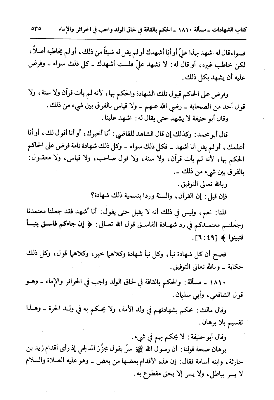 1810 - مَسْأَلَةٌ: وَالْحُكْمُ بِالْقَافَةِ فِي لِحَاقِ الْوَلَدِ وَاجِبٌ فِي الْحَرَائِرِ وَالْإِمَاءِ - وَهُوَ قَوْلُ الشَّافِعِيِّ، وَأَبِي سُلَيْمَانَ.