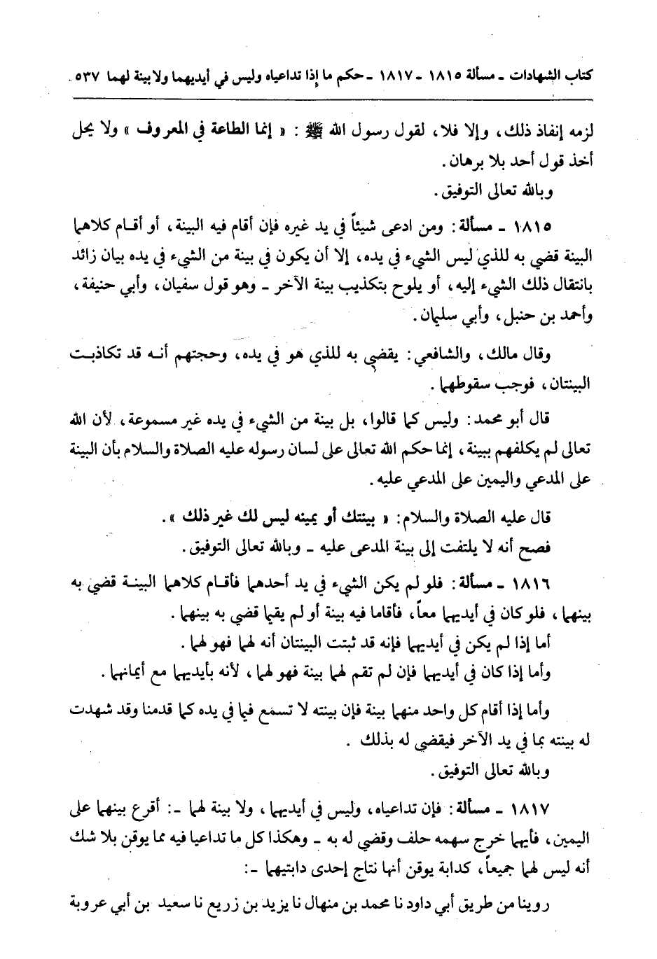1815 - مَسْأَلَةٌ: وَمَنْ ادَّعَى شَيْئًا فِي يَدِ غَيْرِهِ فَإِنْ أَقَامَ فِيهِ الْبَيِّنَةَ، أَوْ أَقَامَ كِلَاهُمَا الْبَيِّنَةَ قُضِيَ بِهِ لِلَّذِي لَيْسَ الشَّيْءُ فِي يَدِهِ، إلَّا أَنْ يَكُونَ فِي بَيِّنَةٍ مَنْ الشَّيْءُ فِي يَدِهِ بَيَانٌ زَائِدٌ بِانْتِقَالِ ذَلِكَ الشَّيْءِ إلَيْهِ، أَوْ يُلَوِّحُ بِتَكْذِيبِ بَيِّنَةِ الْآخَرِ - وَهُوَ قَوْلُ سُفْيَانَ، وَأَبِي حَنِيفَةَ، وَأَحْمَدَ بْنِ حَنْبَلٍ، وَأَبِي سُلَيْمَانَ.