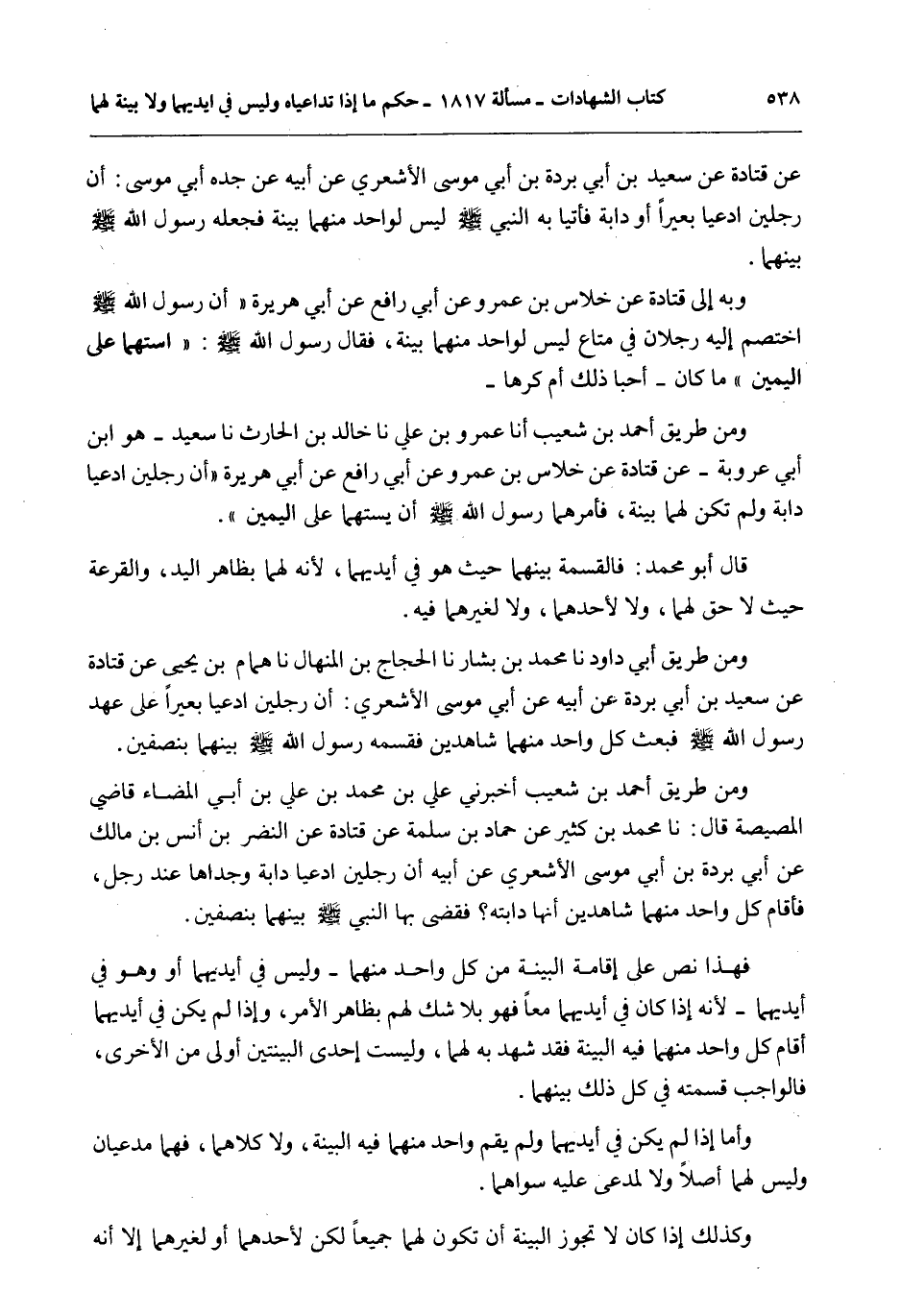 عَنْ قَتَادَةَ عَنْ سَعِيدِ بْنِ أَبِي بُرْدَةَ بْنِ أَبِي مُوسَى الْأَشْعَرِيِّ عَنْ أَبِيهِ عَنْ جَدِّهِ أَبِي مُوسَى: «أَنَّ رَجُلَيْنِ ادَّعَيَا بَعِيرًا أَوْ دَابَّةً فَأَتَيَا بِهِ النَّبِيَّ - صَلَّى اللَّهُ عَلَيْهِ وَسَلَّمَ - لَيْسَ لِوَاحِدٍ مِنْهُمَا بَيِّنَةٌ فَجَعَلَهُ رَسُولُ اللَّهِ - صَلَّى اللَّهُ عَلَيْهِ وَسَلَّمَ - بَيْنَهَا» .