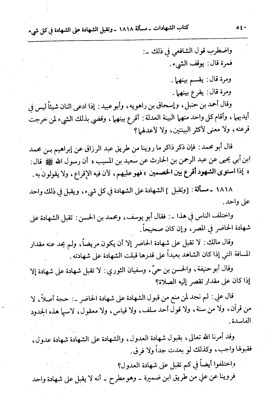 1818 - مَسْأَلَةٌ: الشَّهَادَةُ عَلَى الشَّهَادَةِ فِي كُلِّ شَيْءٍ، وَيُقْبَلُ فِي ذَلِكَ وَاحِدٌ عَلَى وَاحِدٍ.