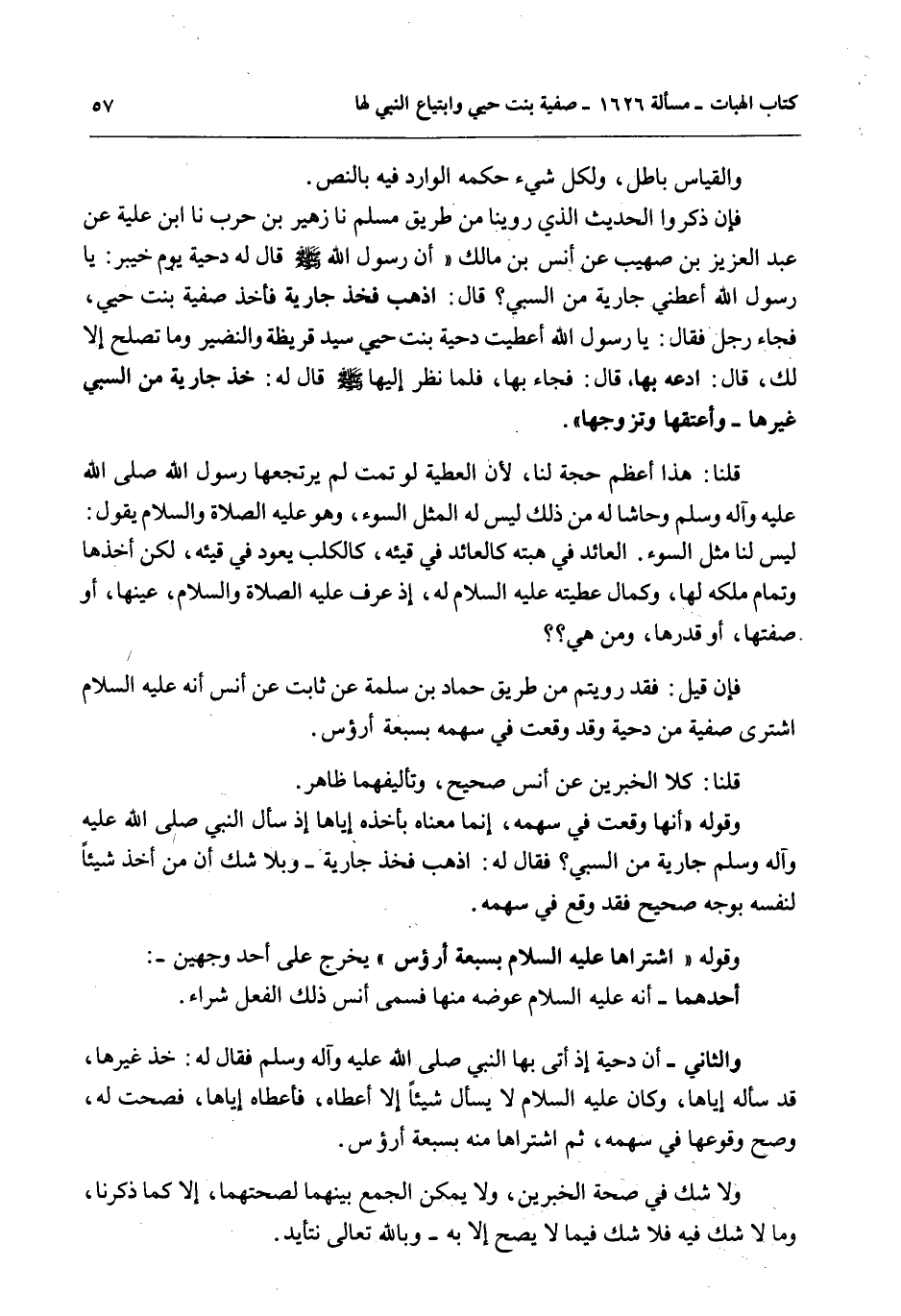 لَكِنَّ أَخْذَهَا وَتَمَامَ مِلْكِهِ لَهَا، وَكَمَالَ عَطِيَّتِهِ - عَلَيْهِ السَّلَامُ - لَهُ، إذْ عَرَفَ - عَلَيْهِ الصَّلَاةُ وَالسَّلَامُ - عَيْنَهَا، أَوْ صِفَتَهَا، أَوْ قَدْرَهَا، وَمَنْ هِيَ؟ ؟ فَإِنْ قِيلَ: فَقَدْ رَوَيْتُمْ مِنْ طَرِيقِ حَمَّادِ بْنِ سَلَمَةَ عَنْ ثَابِتٍ عَنْ أَنَسٍ «أَنَّهُ - عَلَيْهِ السَّلَامُ - اشْتَرَى صَفِيَّةَ مِنْ دِحْيَةَ وَقَدْ وَقَعَتْ فِي سَهْمِهِ بِسَبْعَةِ أَرْؤُسٍ» .
