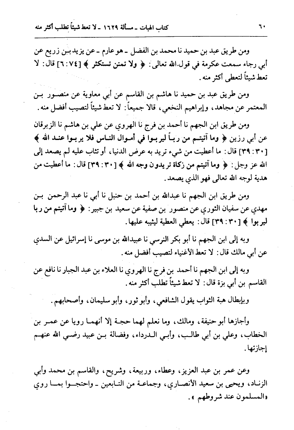 وَبِهِ إلَى ابْنِ الْجَهْمِ نا أَحْمَدُ بْنُ فَرَجٍ نا الْهَرَوِيُّ نا الْعَلَاءُ بْنُ عَبْدِ الْجَبَّارِ نا نَافِعٌ عَنْ الْقَاسِمِ بْنِ أَبِي بَزَّةَ قَالَ: لَا تُعْطِ شَيْئًا تَطْلُبُ أَكْثَرَ مِنْهُ.