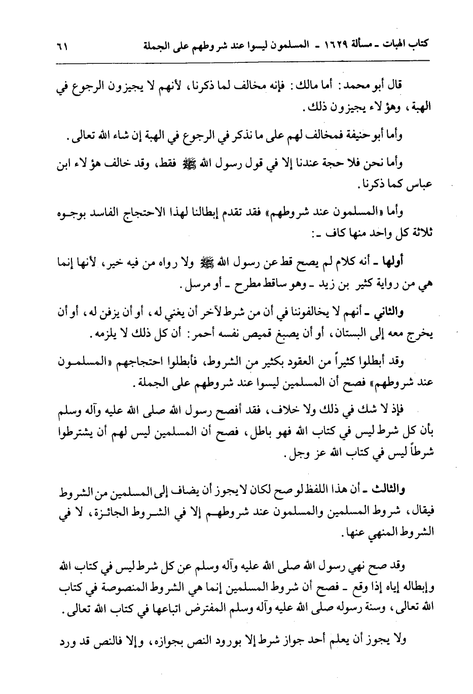 وَقَدْ أَبْطَلُوا كَثِيرًا مِنْ الْعُقُودِ بِكَثِيرٍ مِنْ الشُّرُوطِ، فَأَبْطَلُوا احْتِجَاجَهُمْ «الْمُسْلِمُونَ عِنْدَ شُرُوطِهِمْ» فَصَحَّ أَنَّ الْمُسْلِمِينَ لَيْسُوا عِنْدَ شُرُوطِهِمْ عَلَى الْجُمْلَةِ.