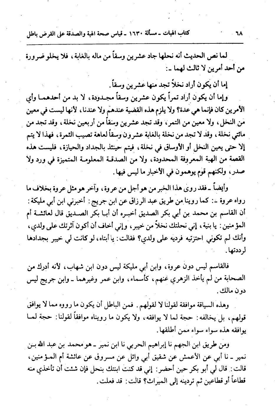 وَأَيْضًا - فَقَدْ رَوَى هَذَا الْخَبَرَ مَنْ هُوَ أَجَلُّ مِنْ عُرْوَةَ، وَآخَرُ هُوَ مِثْلُ عُرْوَةَ بِخِلَافِ مَا رَوَاهُ عُرْوَةُ -: كَمَا رُوِّينَا مِنْ طَرِيق عَبْدِ الرَّزَّاقِ عَنْ ابْنِ جُرَيْجٍ: أَخْبَرَنِي ابْنُ أَبِي مُلَيْكَةَ: أَنَّ الْقَاسِمَ بْنَ مُحَمَّدِ بْنِ أَبِي بَكْرٍ الصِّدِّيقِ أَخْبَرَهُ أَنَّ أَبَا بَكْرٍ الصِّدِّيقَ قَالَ لِعَائِشَةَ أُمِّ الْمُؤْمِنِينَ: يَا بُنَيَّةُ، إنِّي نَحَلْتُك نَخْلًا مِنْ خَيْبَرَ، وَإِنِّي أَخَاف أَنْ أَكُونَ آثَرْتُكِ عَلَى وَلَدِي، وَأَنَّكِ لَمْ تَكُونِي احْتَزْتِيهِ فَرُدِّيهِ عَلَى وَلَدِي؟ فَقَالَتْ: يَا أَبَتَاهُ، لَوْ كَانَتْ لِي خَيْبَرُ بِجِدَادِهَا لَرَدَدْتهَا.