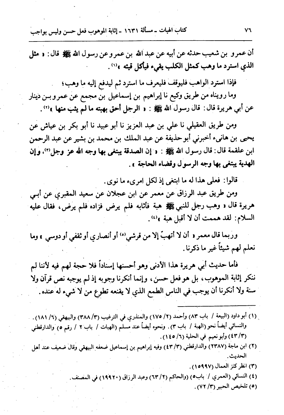 فَأَمَّا حَدِيثُ أَبِي هُرَيْرَةَ هَذَا الْأَدْنَى وَهُوَ أَحْسَنُهَا إسْنَادًا فَلَا حُجَّةَ لَهُمْ فِيهِ لِأَنَّنَا لَمْ نُنْكِرْ إثَابَةَ الْمَوْهُوبِ، بَلْ هُوَ فِعْلٌ حَسَنٌ، وَإِنَّمَا أَنْكَرْنَا وُجُوبَهُ إذْ لَمْ يُوجِبْهُ نَصُّ قُرْآنٍ وَلَا سُنَّةٍ وَلَا أَنْكَرْنَا أَنْ يُوجِبَ فِي النَّاسِ الطَّمَعَ الَّذِي لَا يُقْنِعُهُ تَطَوُّعُ مَنْ لَا شَيْءَ لَهُ عِنْدَهُ.