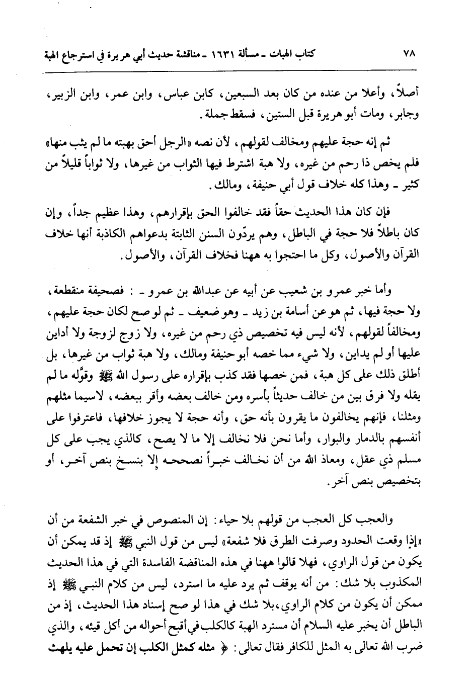 وَأَمَّا خَبَرُ عَمْرِو بْنِ شُعَيْبٍ عَنْ أَبِيهِ عَنْ عَبْدِ اللَّهِ بْنِ عَمْرٍو -: فَصَحِيفَةٌ مُنْقَطِعَةٌ، وَلَا حُجَّةَ فِيهَا، ثُمَّ هُوَ عَنْ أُسَامَةَ بْنِ زَيْدٍ - وَهُوَ ضَعِيفٌ - ثُمَّ لَوْ صَحَّ لَكَانَ حُجَّةً عَلَيْهِمْ، وَمُخَالِفًا لِقَوْلِهِمْ؛ لِأَنَّهُ لَيْسَ فِيهِ تَخْصِيصُ ذِي رَحِمٍ مِنْ غَيْرِهِ، وَلَا زَوْجٍ لِزَوْجَةٍ وَلَا أَدَايَنَ عَلَيْهَا أَوْ لَمْ يُدَايِنْ، وَلَا شَيْءٍ مِمَّا خَصَّهُ أَبُو حَنِيفَةَ وَمَالِكٌ، وَلَا هِبَةَ ثَوَابٍ مِنْ غَيْرِهَا، بَلْ أَطْلَقَ ذَلِكَ عَلَى كُلِّ هِبَةٍ، فَمَنْ خَصَّهَا فَقَدْ كَذَبَ بِإِقْرَارِهِ عَلَى رَسُولِ اللَّهِ - صَلَّى اللَّهُ عَلَيْهِ وَسَلَّمَ - وَقَوَّلَهُ مَا لَمْ يَقُلْهُ وَلَا فَرْقَ بَيْنَ مَنْ خَالَفَ حَدِيثًا بِأَسْرِهِ وَمَنْ خَالَفَ بَعْضَهُ وَأَقَرَّ بِبَعْضِهِ، لَا سِيَّمَا مِثْلُهُمْ وَمِثْلُنَا، فَإِنَّهُمْ يُخَالِفُونَ مَا يُقِرُّونَ بِأَنَّهُ حَقٌّ، وَأَنَّهُ حُجَّةٌ لَا يَجُوزُ خِلَافُهَا، فَاعْتَرَفُوا عَلَى أَنْفُسِهِمْ بِالدَّمَارِ وَالْبَوَارِ، وَأَمَّا نَحْنُ فَلَا نُخَالِفُ إلَّا مَا لَا يَصِحُّ، كَاَلَّذِي يَجِبُ عَلَى كُلِّ مُسْلِمٍ ذِي عَقْلٍ، وَمَعَاذَ اللَّهِ مِنْ أَنْ نُخَالِفَ خَبَرًا نُصَحِّحُهُ إلَّا بِنَسْخٍ بِنَصٍّ آخَرَ، أَوْ بِتَخْصِيصٍ بِنَصٍّ آخَرَ.