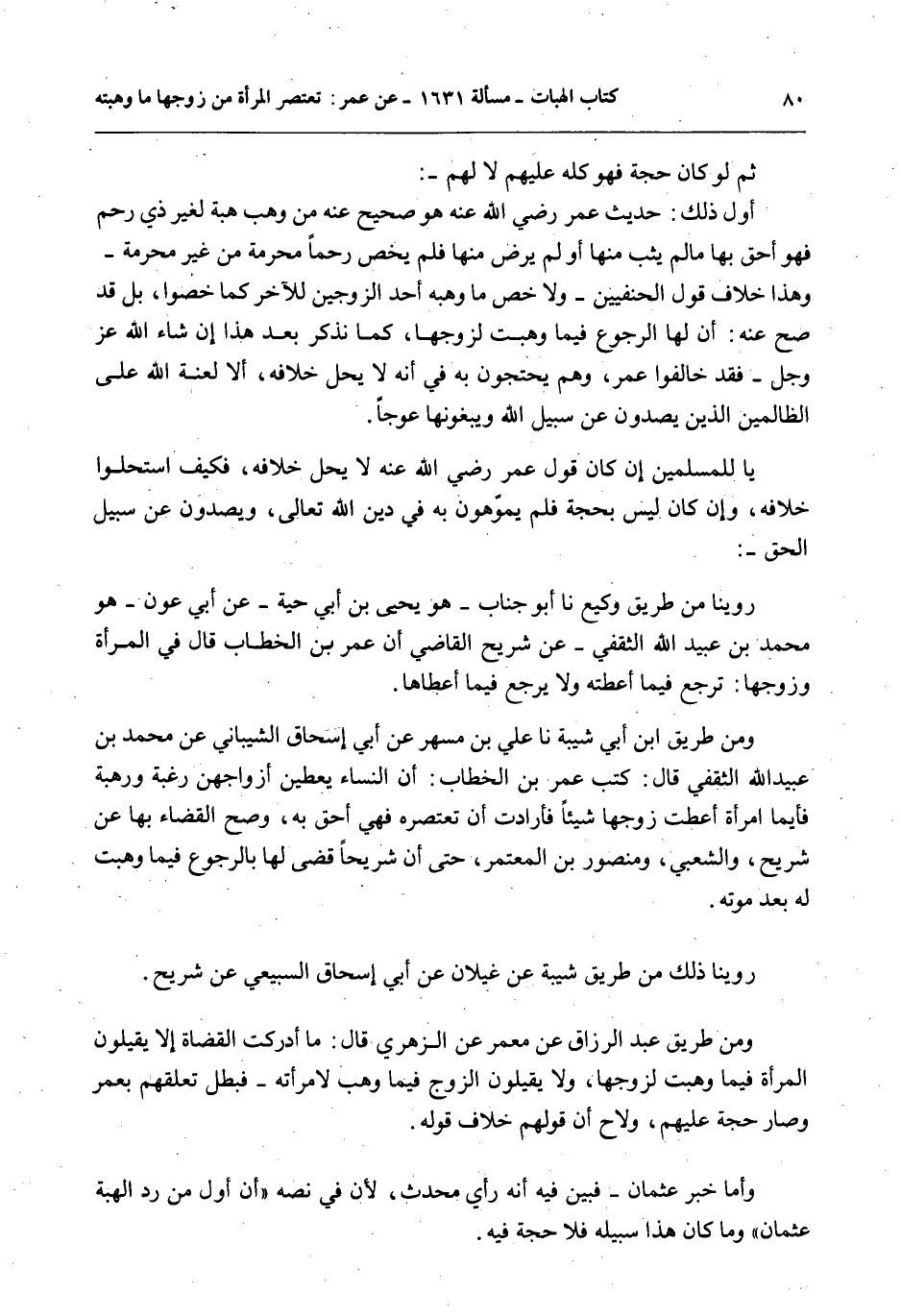 وَمِنْ طَرِيق ابْنِ أَبِي شَيْبَةَ نا عَلِيُّ بْنُ مُسْهِرٍ عَنْ أَبِي إِسْحَاقَ الشَّيْبَانِيِّ عَنْ مُحَمَّدِ بْنِ عُبَيْدِ اللَّهِ الثَّقَفِيِّ قَالَ: كَتَبَ عُمَرُ بْنُ الْخَطَّابِ: أَنَّ النِّسَاءَ يُعْطِينَ أَزْوَاجَهُنَّ رَغْبَةً وَرَهْبَةً فَأَيُّمَا امْرَأَةٍ أَعْطَتْ زَوْجَهَا شَيْئًا فَأَرَادَتْ أَنْ تَعْتَصِرَهُ فَهِيَ أَحَقُّ بِهِ، وَصَحَّ الْقَضَاءُ بِهَا عَنْ شُرَيْحٍ، وَالشَّعْبِيِّ، وَمَنْصُورِ بْنِ الْمُعْتَمِرِ، حَتَّى أَنَّ شُرَيْحًا قَضَى لَهَا بِالرُّجُوعِ فِيمَا وَهَبَتْ. لَهُ بَعْدَ مَوْتِهِ.