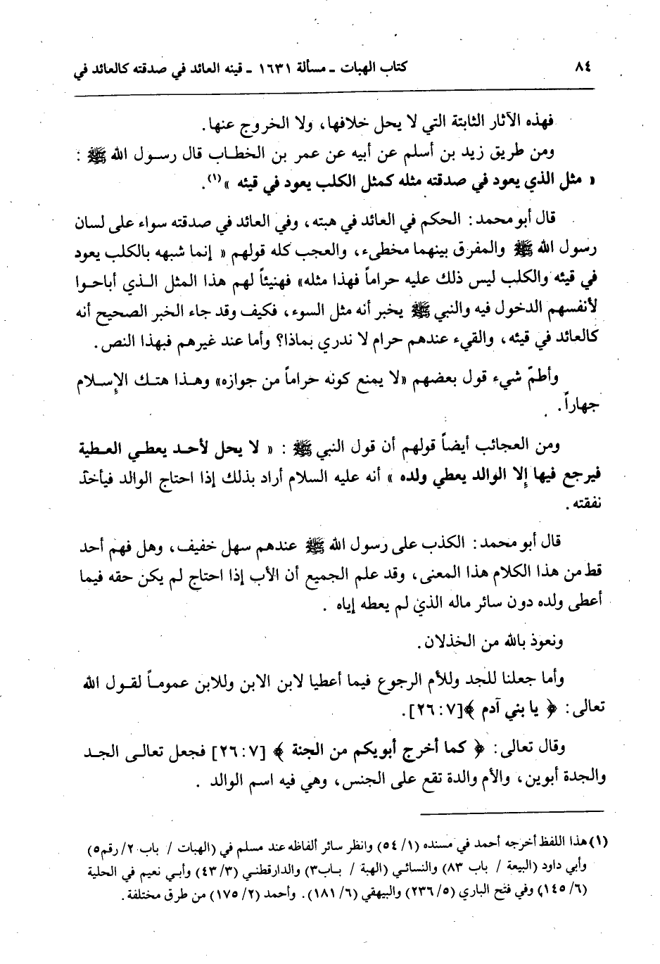 قَالَ أَبُو مُحَمَّدٍ: الْحُكْمُ فِي الْعَائِدِ فِي هِبَتِهِ، وَفِي الْعَائِدِ فِي صَدَقَتِهِ سَوَاءٌ عَلَى لِسَانِ رَسُولِ اللَّهِ - صَلَّى اللَّهُ عَلَيْهِ وَسَلَّمَ - وَالْمُفَرِّقُ بَيْنَهُمَا مُخْطِئٌ، وَالْعَجَبُ كُلُّهُ قَوْلُهُمْ " إنَّمَا شَبَّهَهُ بِالْكَلْبِ يَعُودُ فِي قَيْئِهِ، وَالْكَلْبُ لَيْسَ ذَلِكَ عَلَيْهِ حَرَامًا فَهَذَا مِثْلُهُ " فَهَنِيئًا لَهُمْ هَذَا الْمَثَلُ الَّذِي أَبَاحُوا لِأَنْفُسِهِمْ الدُّخُولَ فِيهِ وَالنَّبِيُّ - صَلَّى اللَّهُ عَلَيْهِ وَسَلَّمَ - يُخْبِرُ أَنَّهُ مَثَلُ السَّوْءِ، فَكَيْفَ وَقَدْ جَاءَ الْخَبَرُ الصَّحِيحُ أَنَّهُ كَالْعَائِدِ فِي قَيْئِهِ، وَالْقَيْءُ عِنْدَهُمْ حَرَامٌ لَا نَدْرِي بِمَاذَا؟ وَأَمَّا عِنْدَ غَيْرِهِمْ فَبِهَذَا النَّصِّ.