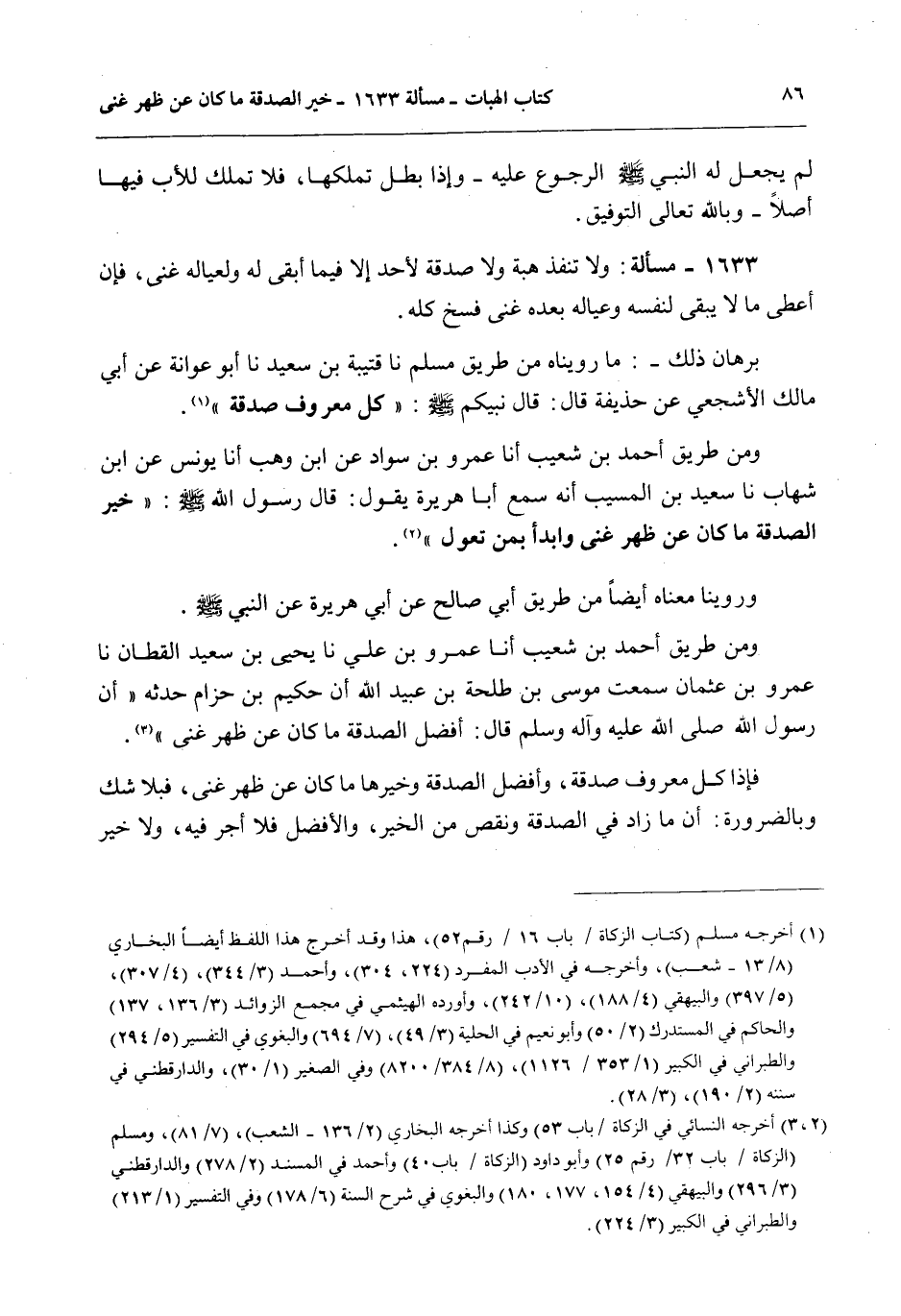 1633 - مَسْأَلَةٌ: وَلَا تَنْفُذُ هِبَةٌ وَلَا صَدَقَةٌ لِأَحَدٍ إلَّا فِيمَا أَبْقَى لَهُ وَلِعِيَالِهِ غِنًى، فَإِنْ أَعْطَى مَا لَا يَبْقَى لِنَفْسِهِ وَعِيَالِهِ بَعْدَهُ غِنًى فُسِخَ كُلَّهُ.