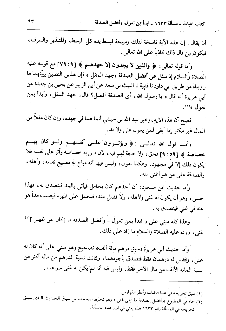 فَصَحَّ أَنَّ هَذِهِ الْآيَةَ، وَخَبَرَ عَبْدِ اللَّهِ بْنِ حَبَشِيٍّ إنَّمَا هُمَا فِي جُهْدِهِ، وَإِنْ كَانَ مُقِلًّا مِنْ الْمَالِ غَيْرَ مُكْثِرٍ إذَا أَبْقَى لِمَنْ يَعُولُ غِنًى وَلَا بُدَّ.