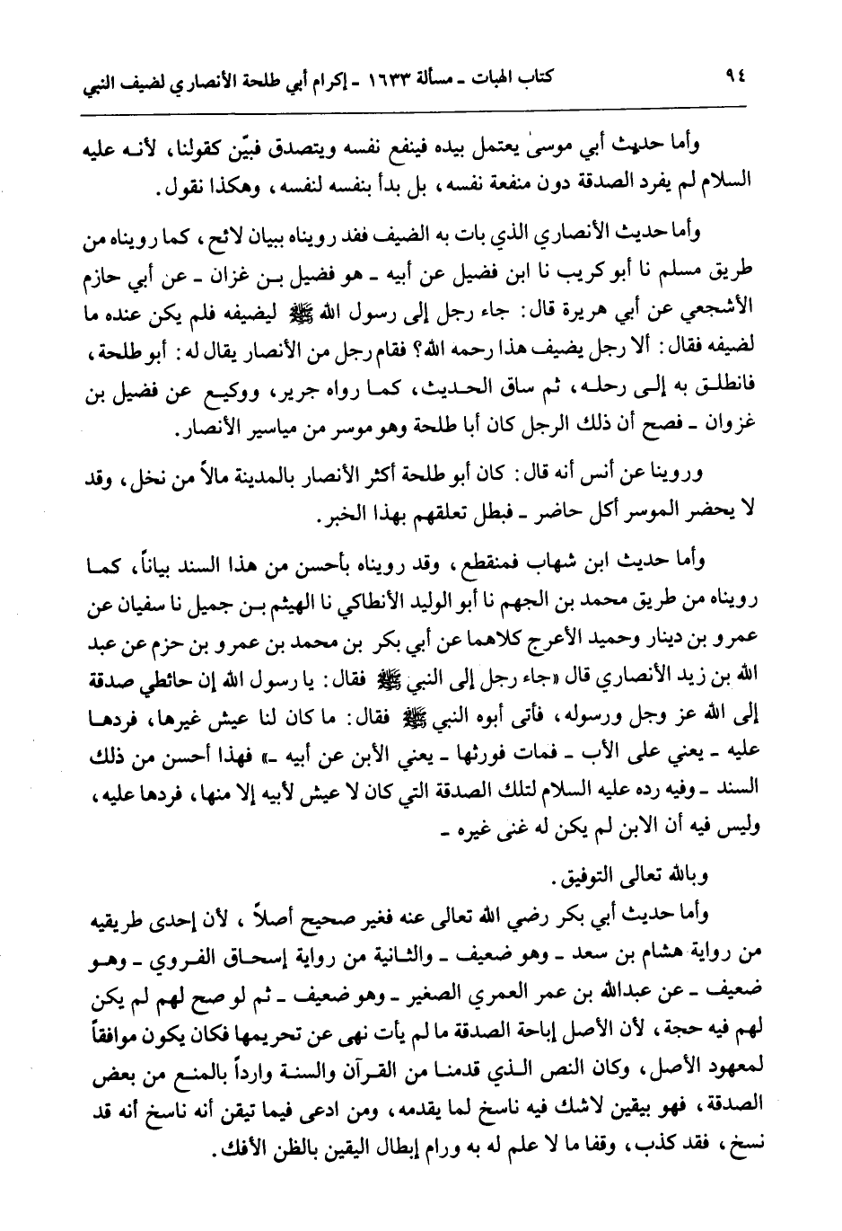 وَأَمَّا حَدِيثُ الْأَنْصَارِيِّ الَّذِي بَاتَ بِهِ الضَّيْفُ فَقَدْ رُوِّينَاهُ بِبَيَانٍ لَائِحٍ، كَمَا رُوِّينَاهُ مِنْ طَرِيق مُسْلِمٍ نا أَبُو كُرَيْبٍ نا ابْنُ فُضَيْلٍ عَنْ أَبِيهِ - هُوَ فُضَيْلُ بْنُ غَزْوَانَ - عَنْ أَبِي حَازِمٍ الْأَشْجَعِيِّ عَنْ أَبِي هُرَيْرَةَ قَالَ: «جَاءَ رَجُلٌ إلَى رَسُولِ اللَّهِ - صَلَّى اللَّهُ عَلَيْهِ وَسَلَّمَ - لِيُضِيفَهُ فَلَمْ يَكُنْ عِنْدَهُ مَا لِضَيْفِهِ فَقَالَ: أَلَا رَجُلٌ يُضِيفُ هَذَا رَحِمَهُ اللَّهُ؟ فَقَامَ رَجُلٌ مِنْ الْأَنْصَارِ يُقَالُ لَهُ: أَبُو طَلْحَةَ، فَانْطَلَقَ بِهِ إلَى رَحْلِهِ» ، ثُمَّ سَاقَ الْحَدِيثَ، كَمَا رَوَاهُ جَرِيرٌ، وَوَكِيعٌ عَنْ فُضَيْلِ بْنِ غَزْوَانَ - فَصَحَّ أَنَّ ذَلِكَ الرَّجُلَ كَانَ أَبَا طَلْحَةَ وَهُوَ مُوسِرٌ مِنْ مَيَاسِيرِ الْأَنْصَارِ.