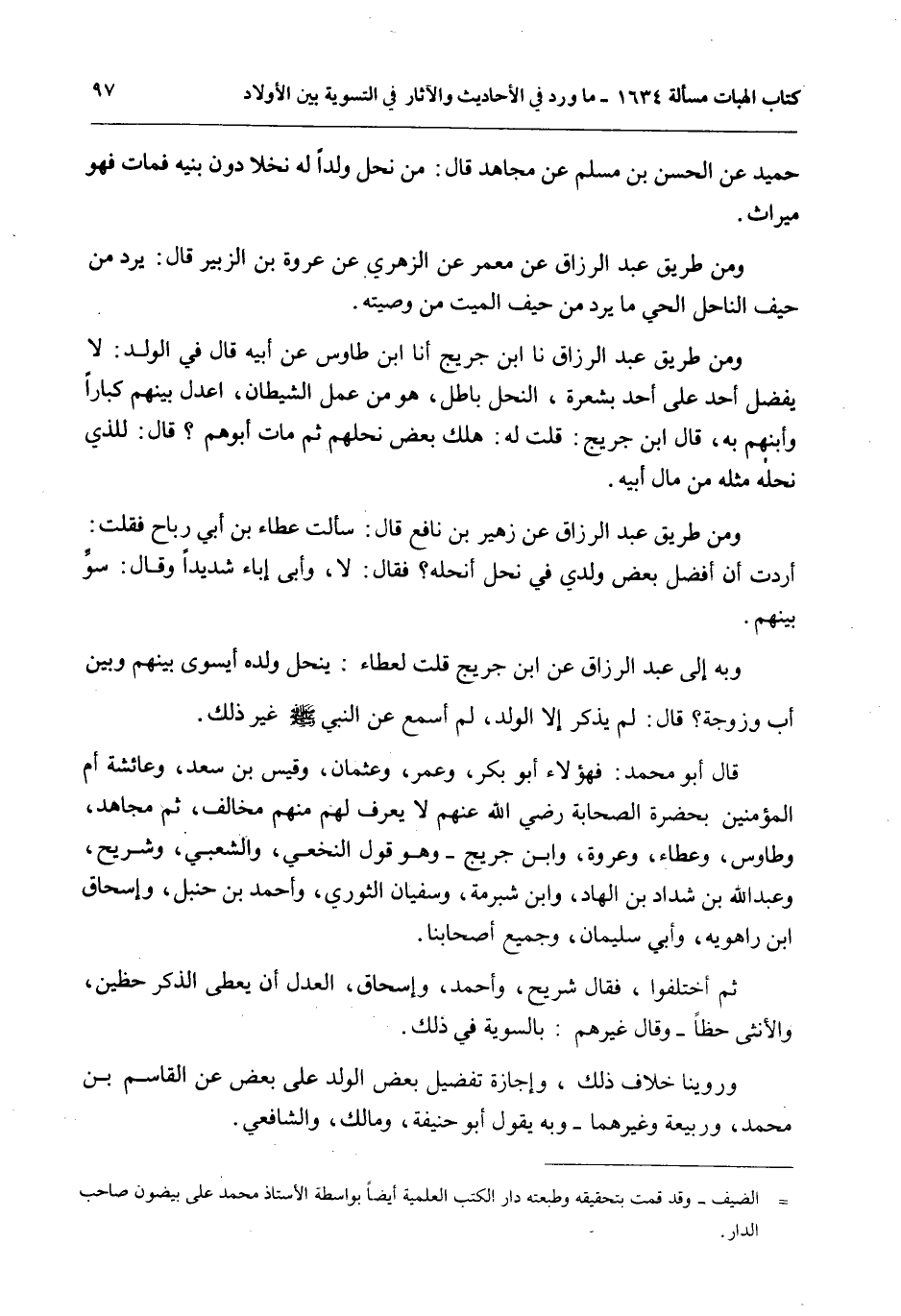 وَمِنْ طَرِيقِ عَبْدِ الرَّزَّاقِ نا ابْنُ جُرَيْجٍ نا ابْنُ طَاوُسٍ عَنْ أَبِيهِ قَالَ فِي الْوَلَدِ: لَا يُفَضَّلُ أَحَدٌ عَلَى أَحَدٍ بِشَعْرَةٍ، النُّحْلُ بَاطِلٌ، هُوَ مِنْ عَمَلِ الشَّيْطَانِ، اعْدِلْ بَيْنَهُمْ كِبَارًا وَأَبِنْهُمْ بِهِ، قَالَ ابْنُ جُرَيْجٍ: قُلْت لَهُ: هَلَكَ بَعْضُ نُحْلِهِمْ ثُمَّ مَاتَ أَبُوهُمْ؟ قَالَ: لِلَّذِي نَحَلَهُ مِثْلُهُ مِنْ مَالِ أَبِيهِ.