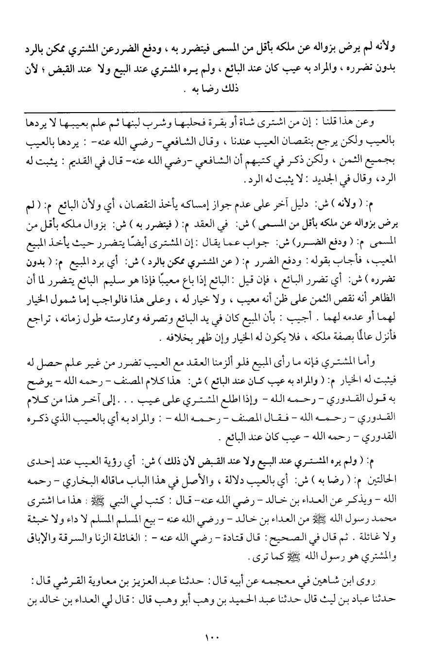 م: (ولم يره المشتري عند البيع ولا عند القبض؛ لأن ذلك) ش: أي رؤية العيب عند إحدى الحالتين م: (رضا به) ش: أي بالعيب دلالة، والأصل في هذا الباب ما قاله البخاري - رَحِمَهُ اللَّهُ - ويذكر «عن العداء بن خالد - رَضِيَ اللَّهُ عَنْهُ - قال: كتب لي النبي - صَلَّى اللَّهُ عَلَيْهِ وَسَلَّمَ -: هذا ما اشترى محمد رسول الله - صَلَّى اللَّهُ عَلَيْهِ وَسَلَّمَ - من العداء بن خالد - رَضِيَ اللَّهُ عَنْهُ - بيع المسلم المسلم لا داء ولا خبثة ولا غائلة» . ثم قال في الصحيح: قال قتادة - رَضِيَ اللَّهُ عَنْهُ -: الغائلة الزنا والسرقة والإباق، والمشتري هو رسول الله - صَلَّى اللَّهُ عَلَيْهِ وَسَلَّمَ - كما ترى.