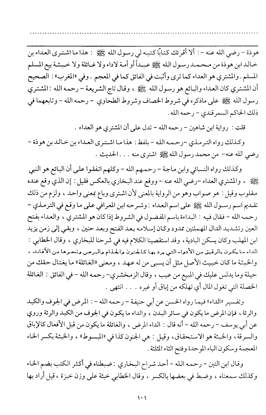 ـــــــــــــــــــــــــــــQهوذة - رَضِيَ اللَّهُ عَنْهُ -: ألا أقرئك كتابا كتبه لي رسول الله - صَلَّى اللَّهُ عَلَيْهِ وَسَلَّمَ -: هذا ما اشترى العداء بن خالد بن هوذة من محمد رسول الله - صَلَّى اللَّهُ عَلَيْهِ وَسَلَّمَ - عبدا أو أمة؛ لأداء ولا غائلة ولا خبثة بيع المسلم المسلم.» والمشتري: هو العداء كما ترى، وأثبت في الفائق كما في المعجم. وفي " المغرب ": الصحيح أن المشتري كان العداء والبائع هو رسول الله - صَلَّى اللَّهُ عَلَيْهِ وَسَلَّمَ -، وقال تاج الشريعة - رَحِمَهُ اللَّهُ -: المشتري رسول الله - صَلَّى اللَّهُ عَلَيْهِ وَسَلَّمَ - على ما ذكره في شروط الخصاف، وشروط الطحاوي - رَحِمَهُ اللَّهُ - وتابعهما في ذلك الحاكم السمرقندي - رَحِمَهُ اللَّهُ -.