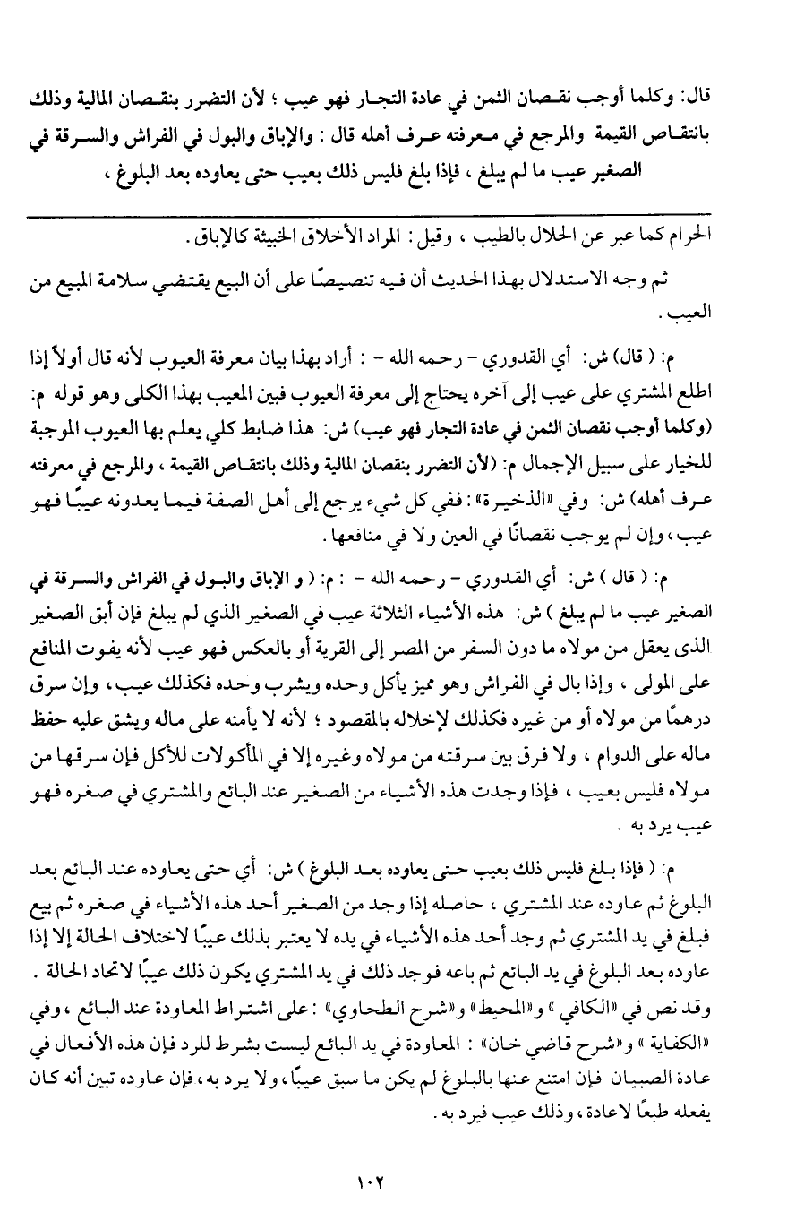 قال: والإباق والبول في الفراش والسرقة في الصغير عيب ما لم يبلغ، فإذا بلغ فليس ذلك بعيب حتى يعاوده بعد البلوغ