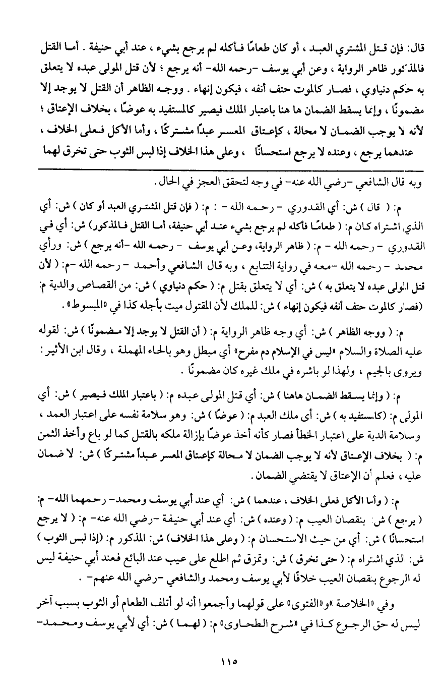 م: (قال) ش: أي القدوري - رَحِمَهُ اللَّهُ -: م: (فإن قتل المشتري العبد أو كان) ش: أي الذي اشتراه كان م: (طعاما فأكله لم يرجع بشيء عند أبي حنيفة، أما القتل فالمذكور) ش: أي في القدوري - رَحِمَهُ اللَّهُ - م: (ظاهر الرواية، وعن أبي يوسف - رَحِمَهُ اللَّهُ - أنه يرجع) ش: ورأي محمد - رَحِمَهُ اللَّهُ - معه في رواية التتابع، وبه قال الشافعي وأحمد - رَحِمَهُ اللَّهُ - م: (لأن قتل المولى عبده لا يتعلق به) ش: أي لا يتعلق بقتل م: (حكم دنياوي) ش: من القصاص والدية م: (فصار كالموت حتف أنفه فيكون إنهاء) ش: للملك؛ لأن المقتول ميت بأجله كذا في " المبسوط ".