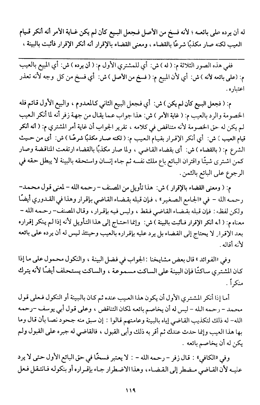 أما إذا أنكر المشتري الأول أن يكون هذا العيب عنده ثم كان بالبينة أو النكول فعلى قول محمد - رَحِمَهُ اللَّهُ - ليس له أن يخاصم بائعه لمكان التناقض، وعلى قول أبي يوسف - رَحِمَهُ اللَّهُ - له ذلك لتكذيب القاضي إياه بالبينة وعامتهم قالوا: إن سبق منه جحود نصا بأن قال وما بها هذا العيب وإنما حدث عندك ثم أقر به ذلك وأبى القبول، فالقاضي له جبره على القبول ولم يكن له أن يخاصم بائعه.