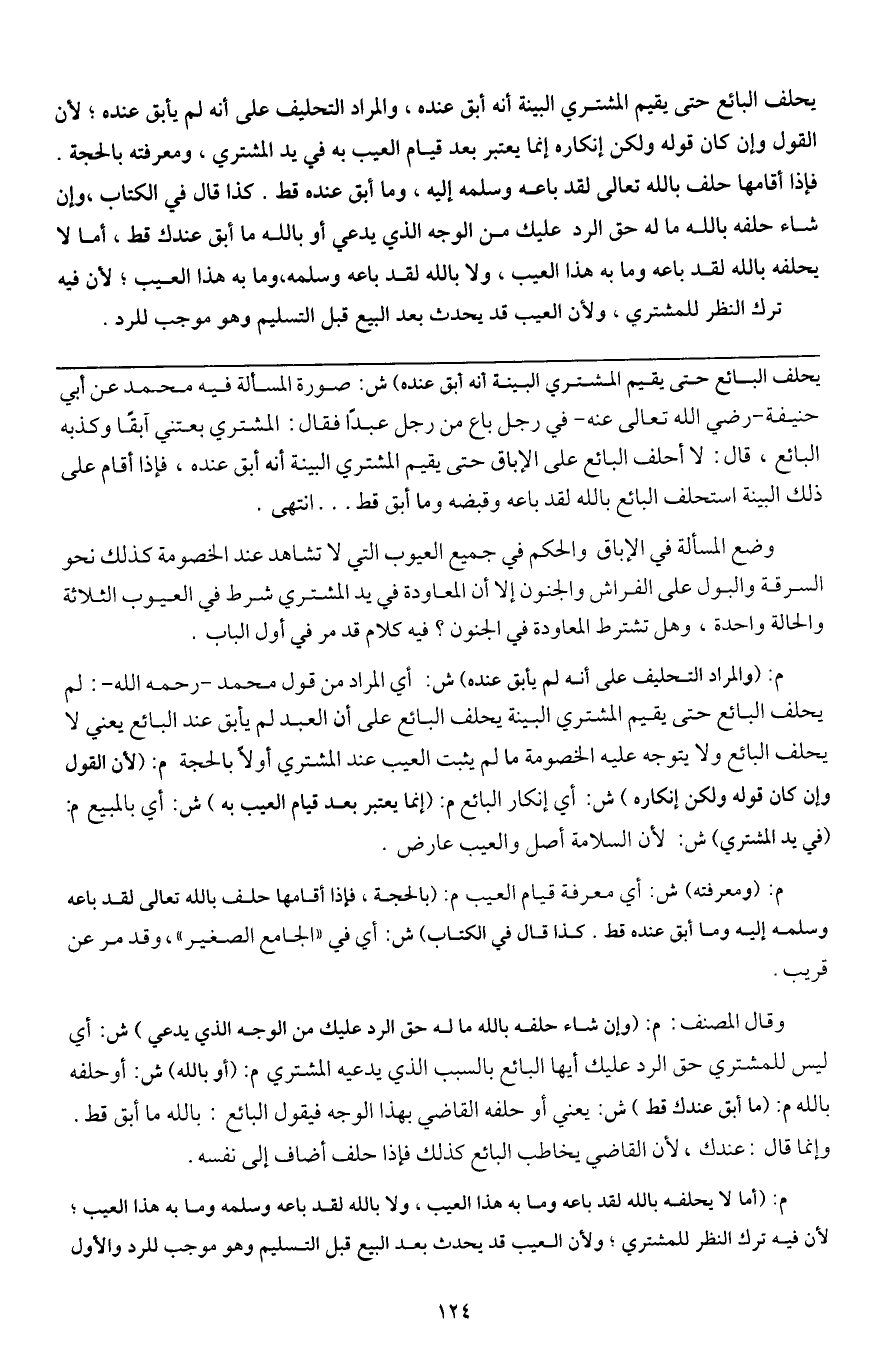 ـــــــــــــــــــــــــــــQيحلف البائع حتى يقيم المشتري البينة أنه أبق عنده) ش: صورة المسألة فيه محمد عن أبي حنيفة - رَضِيَ اللَّهُ تَعَالَى عَنْهُ - في رجل باع من رجل عبدا فقال المشتري: بعتني آبقا وكذبه البائع، قال: لا أحلف البائع على الإباق حتى يقيم المشتري البينة أنه أبق عنده، فإذا أقام على ذلك البينة استحلف البائع بالله لقد باعه وقبضه وما أبق قط ... انتهى.