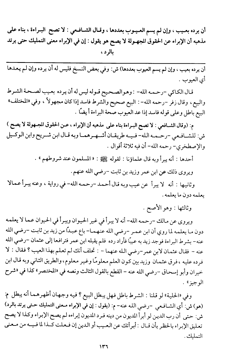 ويروى عن مالك - رَحِمَهُ اللَّهُ - أنه لا يبرأ في غير الحيوان ويبرأ في الحيوان عما لا يعلمه دون ما يعلمه لما روي أن ابن عمر - رَضِيَ اللَّهُ عَنْهُمَا - باع عبدا من زيد بن ثابت - رَضِيَ اللَّهُ عَنْهُ - بشرط البراءة فوجد زيد به عيبا فأراد رده فلم يقبله ابن عمر، فترافعا إلى عثمان - رَضِيَ اللَّهُ عَنْهُ - فقال عثمان لابن عمر - رَضِيَ اللَّهُ عَنْهُمَا -: تحلف أنك لم تعلم بهذا العيب؟ فقال: لا فرده عليه، فرق عثمان وزيد بين كون العلم معلوما وغير معلوم، والطريق الثاني وبه قال ابن خيران وأبو إسحاق - رَضِيَ اللَّهُ عَنْهُ - القطع بالقول الثالث ونصه في " المختصر " كذا في " شرح الوجيز ".