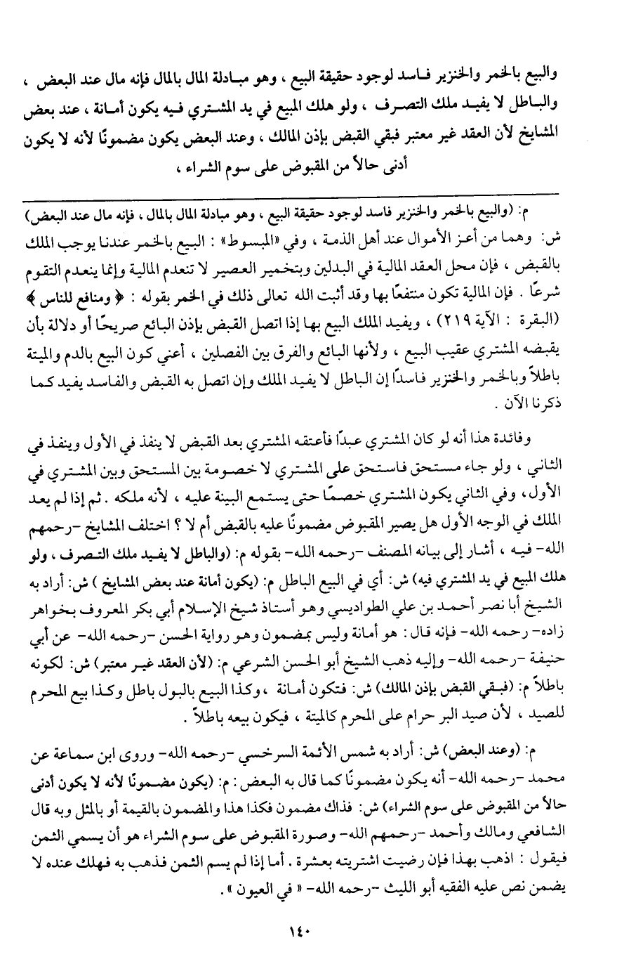 والبيع بالخمر والخنزير فاسد لوجود حقيقة البيع، وهو مبادلة المال بالمال فإنه مال عند البعض، والباطل لا يفيد ملك التصرف، ولو هلك المبيع في يد المشتري فيه يكون أمانة، عند بعض المشايخ لأن العقد غير معتبر فبقي القبض بإذن المالك، وعند البعض يكون مضمونا لأنه لا يكون أدنى حالا من المقبوض على سوم الشراء،