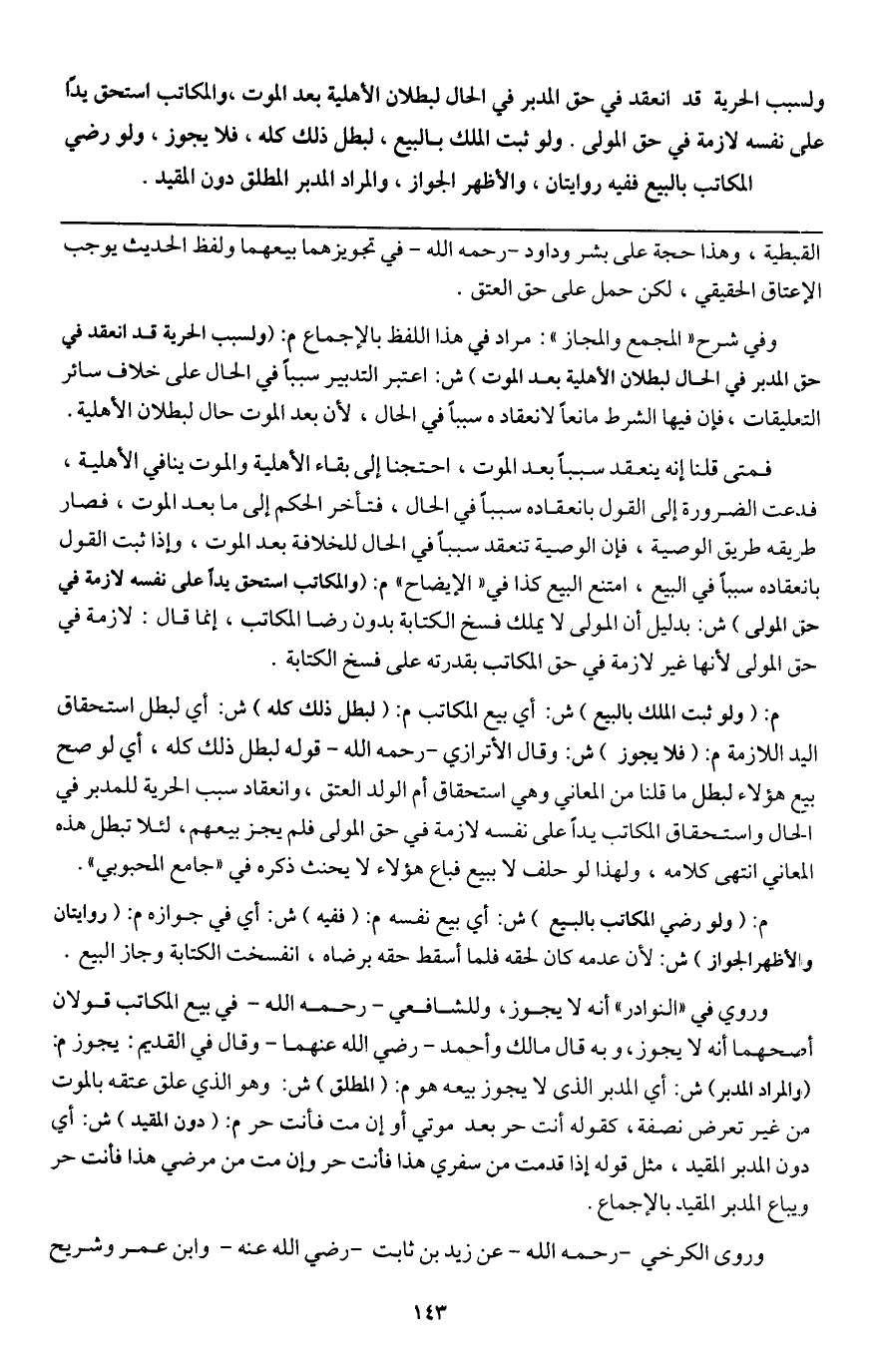 ولسبب الحرية قد انعقد في حق المدبر في الحال لبطلان الأهلية بعد الموت، والمكاتب استحق يدا على نفسه لازمة في حق المولى. ولو ثبت الملك بالبيع، لبطل ذلك كله، فلا يجوز، ولو رضي المكاتب بالبيع ففيه روايتان، والأظهر الجواز، والمراد المدبر المطلق دون المقيد.
