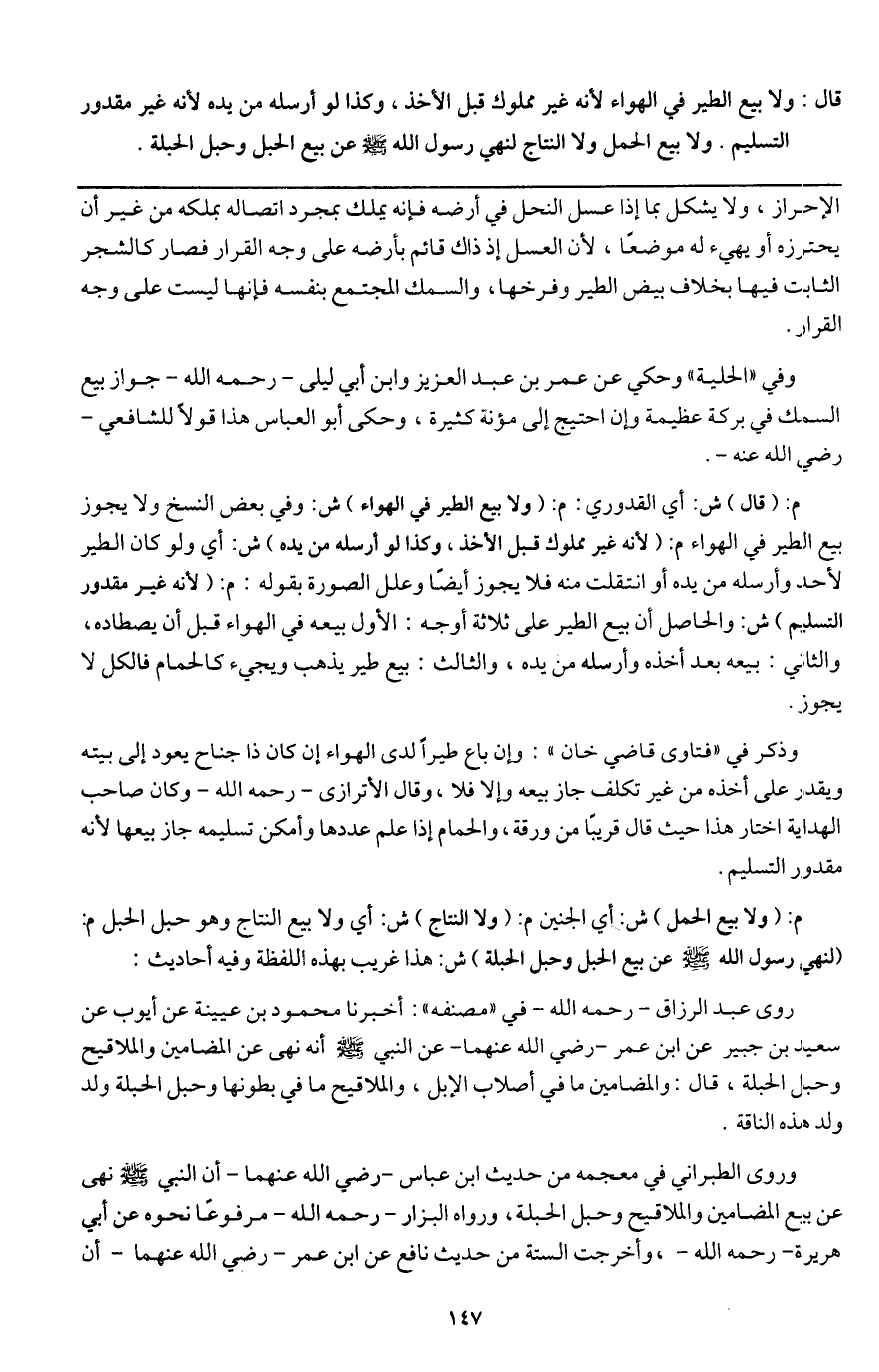 قال: ولا بيع الطير في الهواء لأنه غير مملوك قبل الأخذ، وكذا لو أرسله من يده لأنه غير مقدور التسليم. ولا بيع الحمل ولا النتاج لنهي رسول الله - صَلَّى اللَّهُ عَلَيْهِ وَسَلَّمَ - عن بيع الحبل وحبل الحبلة.