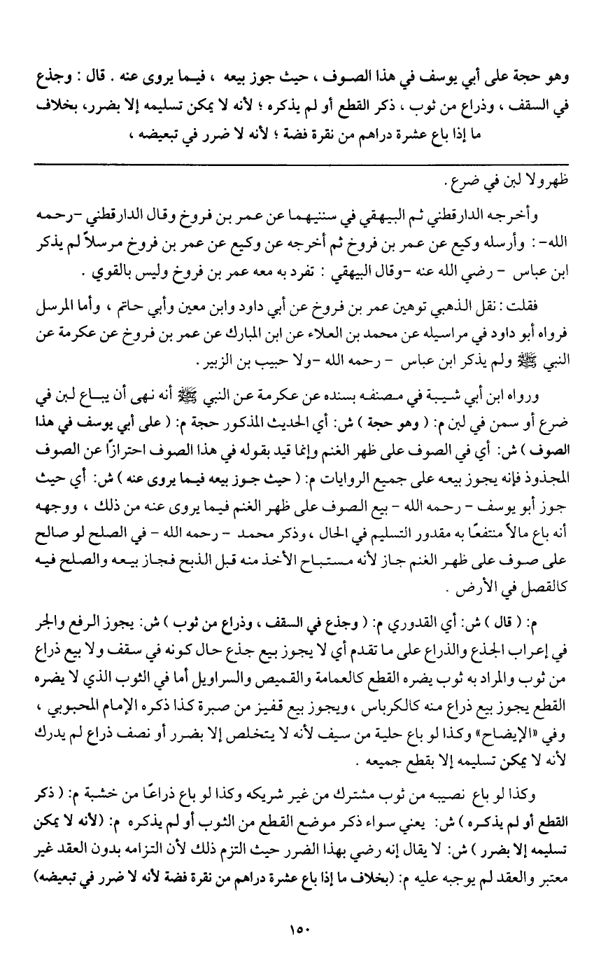 ورواه ابن أبي شيبة في مصنفه بسنده عن عكرمة عن «النبي - صَلَّى اللَّهُ عَلَيْهِ وَسَلَّمَ - أنه نهى أن يباع لبن في ضرع أو سمن في لبن» م: (وهو حجة) ش: أي الحديث المذكور حجة م: (على أبي يوسف في هذا الصوف) ش: أي في الصوف على ظهر الغنم، وإنما قيد بقوله في هذا الصوف احترازا عن الصوف المجذوذ فإنه يجوز بيعه على جميع الروايات م: (حيث جوز بيعه فيما يروى عنه) ش: أي حيث جوز أبو يوسف - رَحِمَهُ اللَّهُ - بيع الصوف على ظهر الغنم فيما يروى عنه من ذلك، ووجهه أنه باع مالا منتفعا به مقدور التسليم في الحال، وذكر محمد - رَحِمَهُ اللَّهُ - في الصلح لو صالح على صوف على ظهر الغنم جاز لأنه مستباح الأخذ منه قبل الذبح فجاز بيعه والصلح فيه كالقصل في الأرض.
