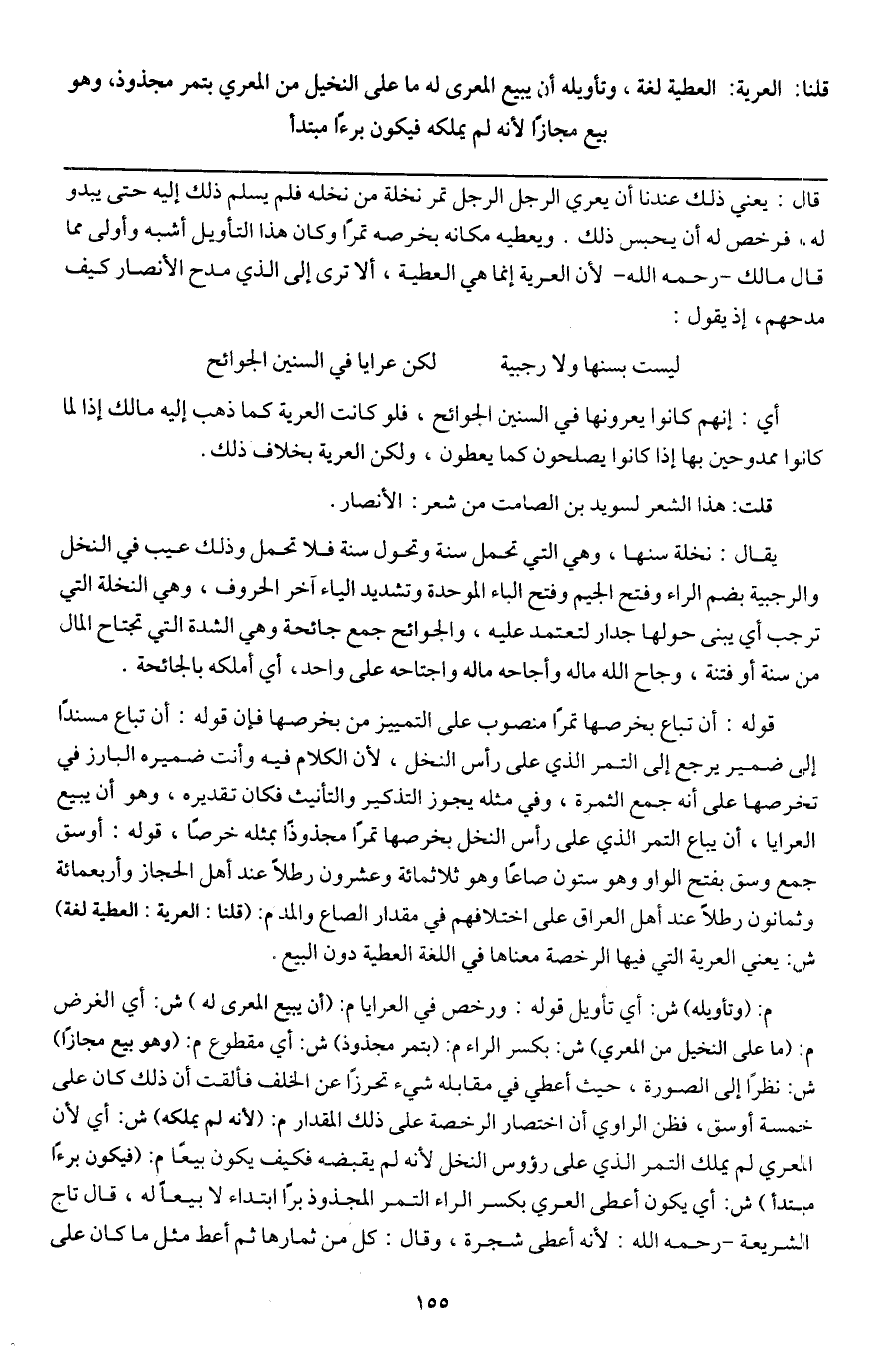 ـــــــــــــــــــــــــــــQقال: يعني ذلك عندنا أن يعري الرجل الرجل تمر نخلة من نخله فلم يسلم ذلك إليه حتى يبدو له، فرخص له أن يحبس ذلك. ويعطيه مكانه بخرصه تمرا وكان هذا التأويل أشبه وأولى مما قال مالك - رَحِمَهُ اللَّهُ - لأن العرية إنما هي العطية، ألا ترى إلى الذي مدح الأنصار كيف مدحهم، إذ يقول: