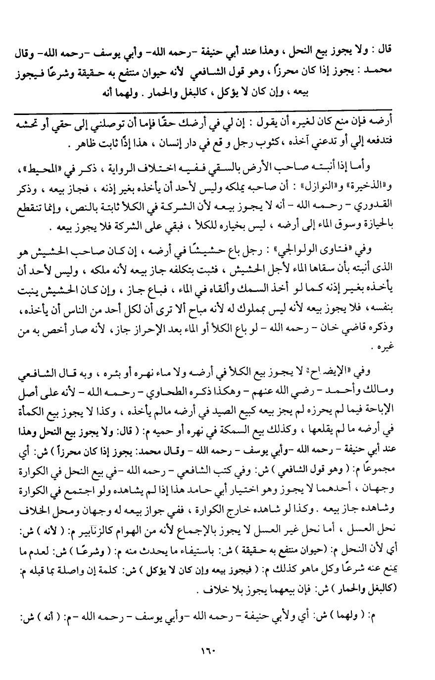 وفي " الإيضاح " لا يجوز بيع الكلأ في أرضه ولا ماء نهره أو بئره، وبه قال الشافعي ومالك وأحمد - رَضِيَ اللَّهُ عَنْهُمْ - وهكذا ذكره الطحاوي - رَحِمَهُ اللَّهُ - لأنه على أصل الإباحة فيما لم يحرزه لم يجز بيعه كبيع الصيد في أرضه ما لم يأخذه، وكذا لا يجوز بيع الكمأة في أرضه ما لم يقلعها، وكذلك بيع السمكة في نهره أو حميه م: (قال: ولا يجوز بيع النحل وهذا عند أبي حنيفة - رَحِمَهُ اللَّهُ - وأبي يوسف - رَحِمَهُ اللَّهُ - وقال محمد: يجوز إذا كان محرزا) ش: أي مجموعا م: (وهو قول الشافعي) ش: وفي كتب الشافعي - رَحِمَهُ اللَّهُ - في بيع النحل في الكوارة وجهان، أحدهما لا يجوز وهو اختيار أبي حامد هذا إذا لم يشاهده ولو اجتمع في الكوارة وشاهده جاز بيعه. وكذا لو شاهده خارج الكوارة، ففي جواز بيعه له وجهان ومحل الخلاف نحل العسل، أما نحل غير العسل لا يجوز بالإجماع لأنه من الهوام كالزنابير م: (لأنه) ش: أي لأن النحل م: (حيوان منتفع به حقيقة) ش: باستيفاء ما يحدث منه م: (وشرعا) ش: لعدم ما يمنع عنه شرعا وكل ما هو كذلك م: (فيجوز بيعه وإن كان لا يؤكل) ش: كلمة إن واصلة بما قبله م: (كالبغل والحمار) ش: فإن بيعهما يجوز بلا خلاف.