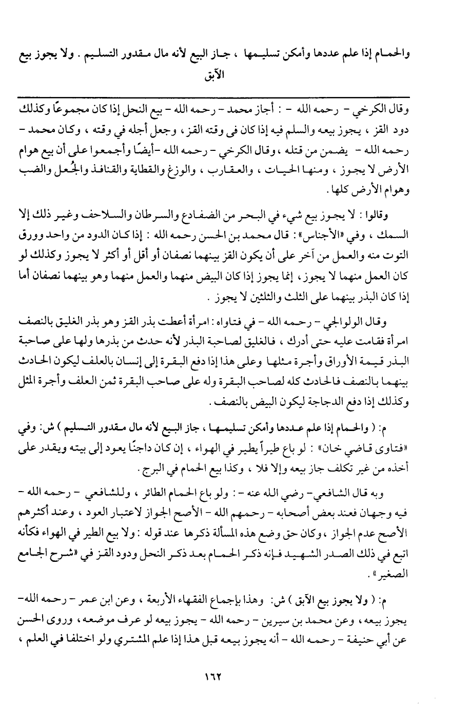ـــــــــــــــــــــــــــــQوقال الكرخي - رَحِمَهُ اللَّهُ -: أجاز محمد - رَحِمَهُ اللَّهُ - بيع النحل إذا كان مجموعا وكذلك دود القز، يجوز بيعه والسلم فيه إذا كان في وقته القز، وجعل أجله في وقته، وكان محمد - رَحِمَهُ اللَّهُ - يضمن من قتله، وقال الكرخي - رَحِمَهُ اللَّهُ - أيضا وأجمعوا على أن بيع هوام الأرض لا يجوز، ومنها الحيات، والعقارب، والوزغ والقطاية والقنافذ والجعل والضب وهوام الأرض كلها.